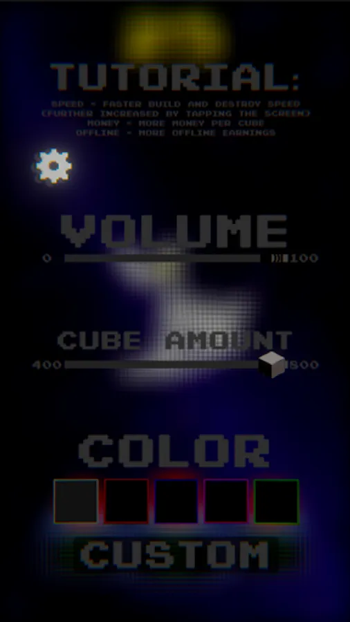 Destroy the Cubes that randomly generate in interesting patterns and earn Money! Use your money to upgrade your speed, Money gain and Offline Earnings! You can also play around with the settings and even add your own Textures! Tap the Screen to destroy even more Cubes and see what you get from the shiny gold Cubes.