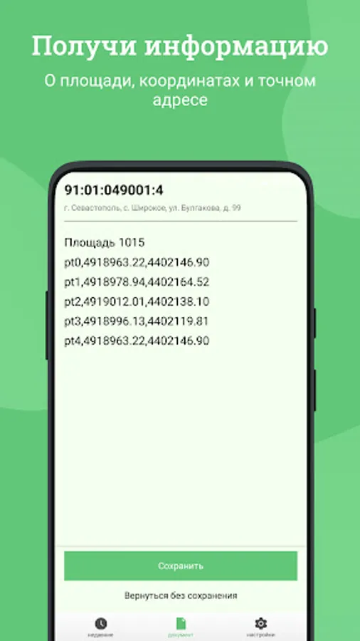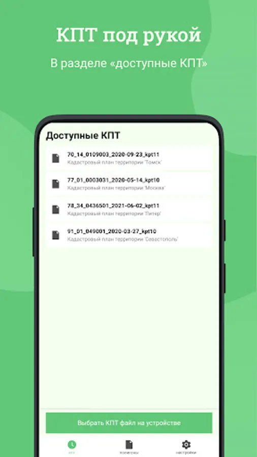 Download the CBT file (cadastral plan of the territory) to your phone and in 30 seconds get the coordinates of the desired site through the application.