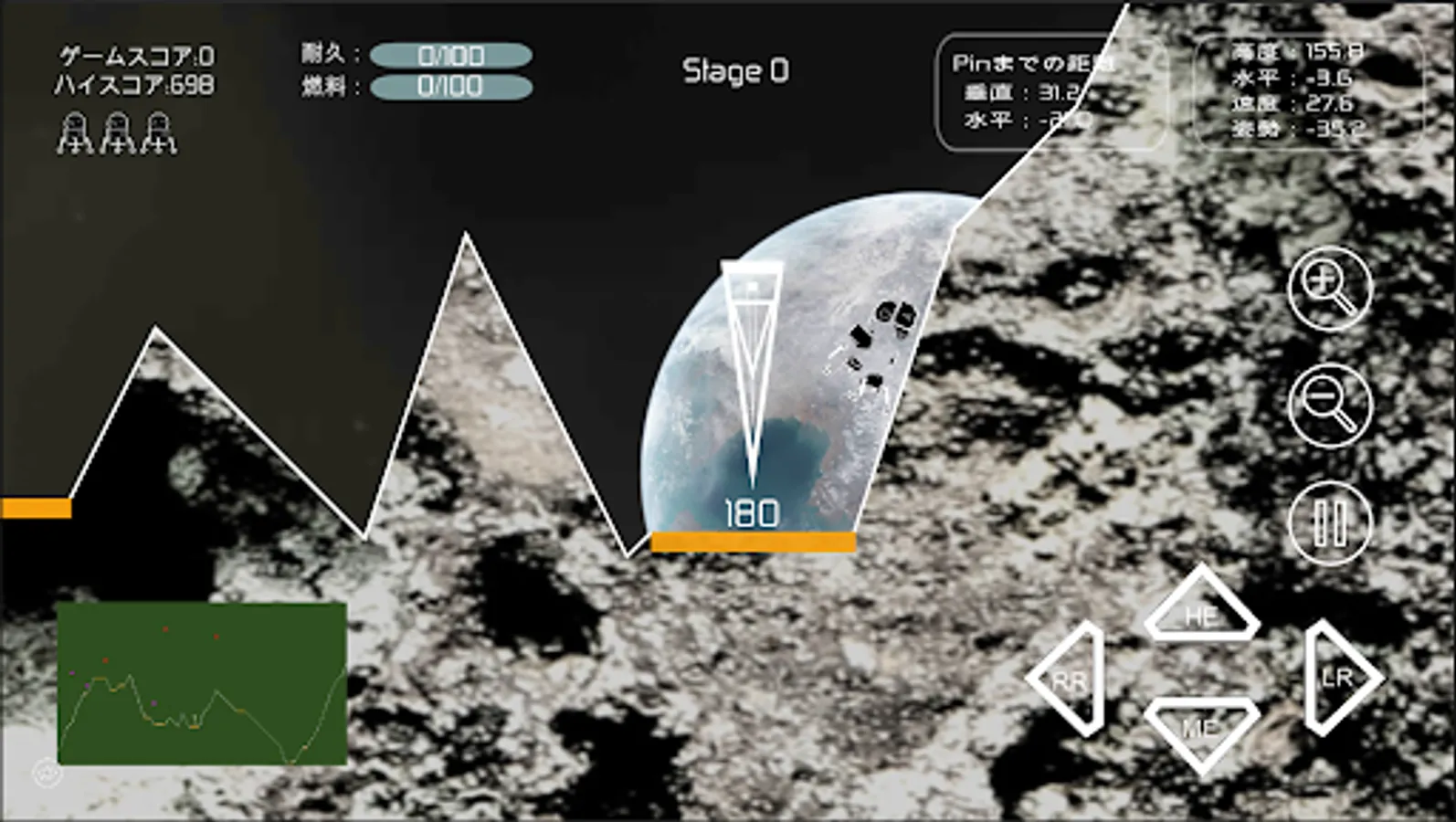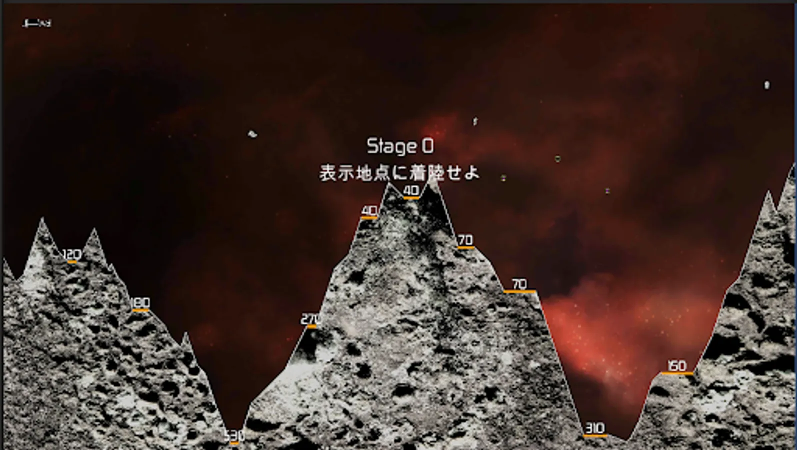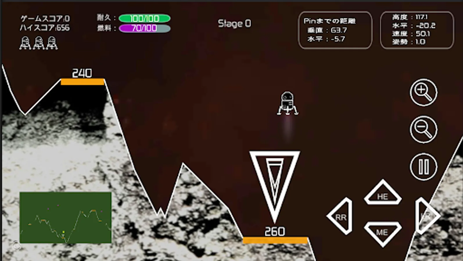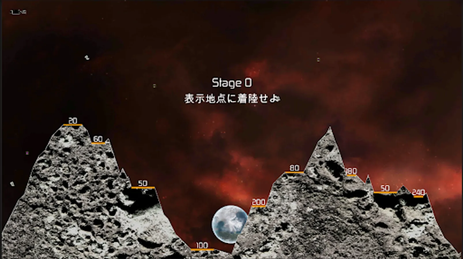 It is a moon landing game. Maneuver the lander well and land at the target point.