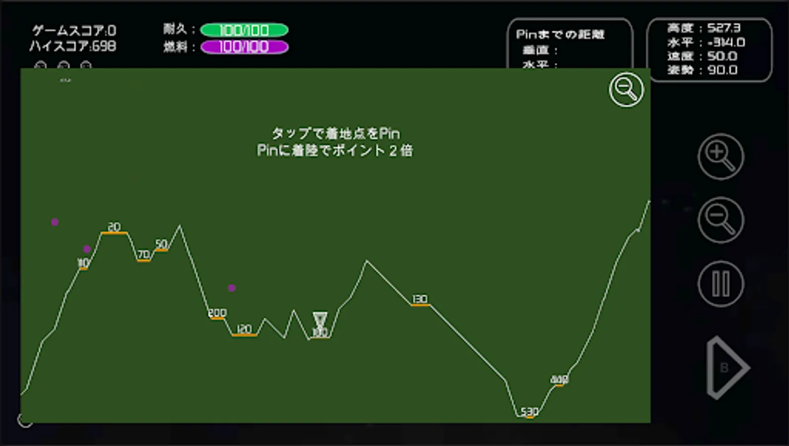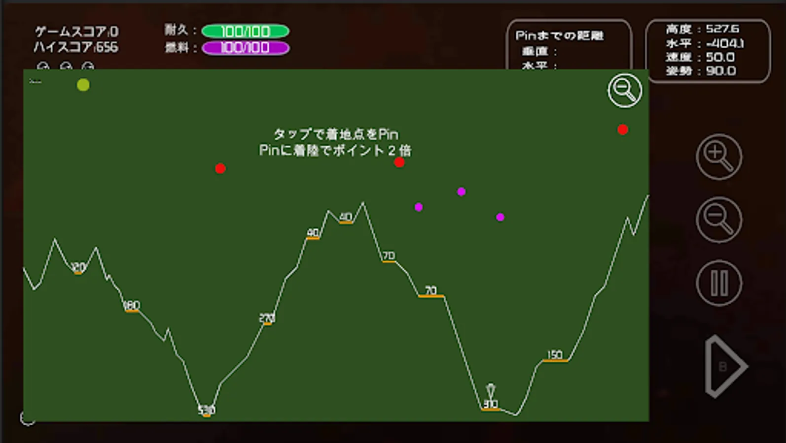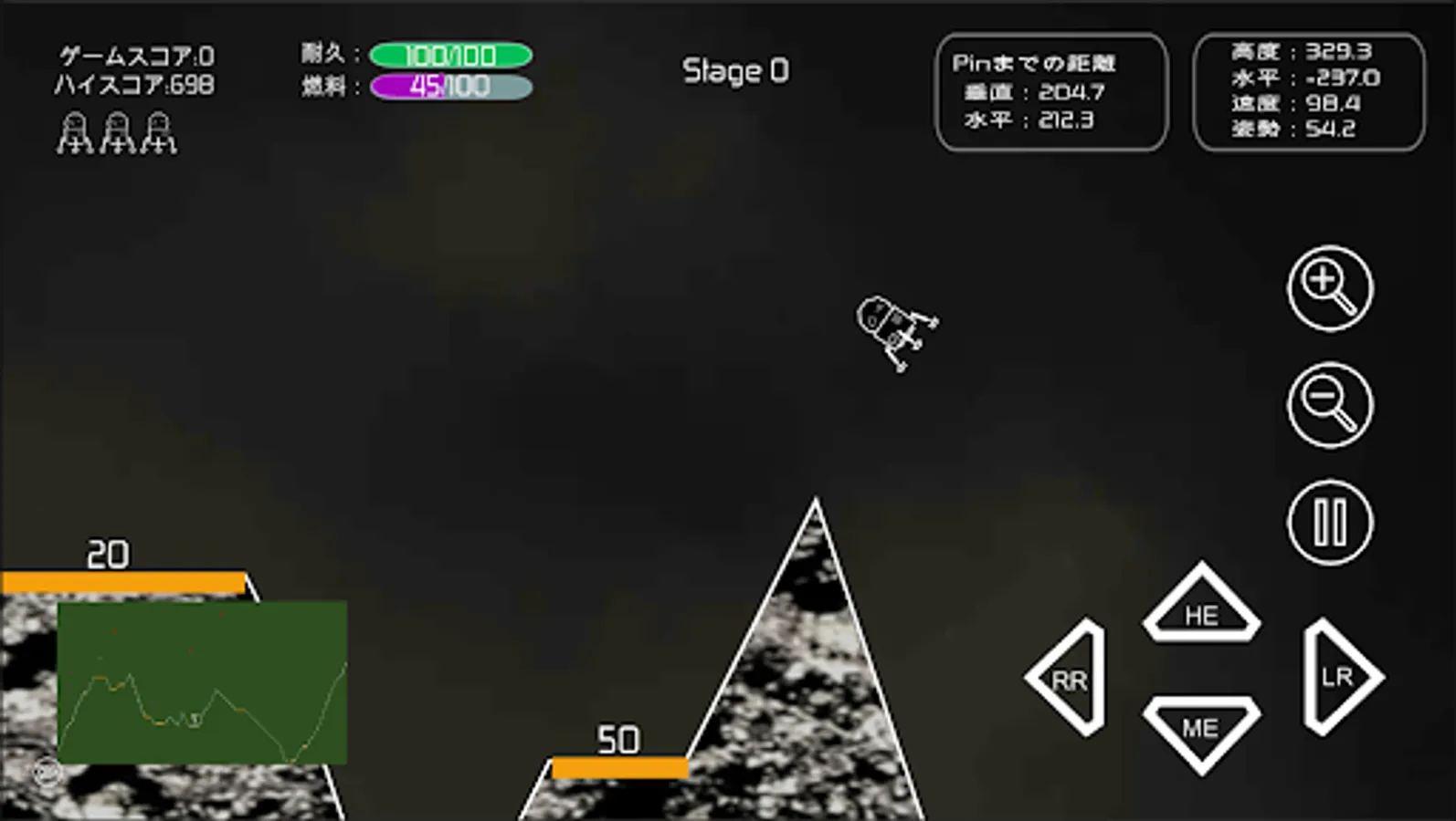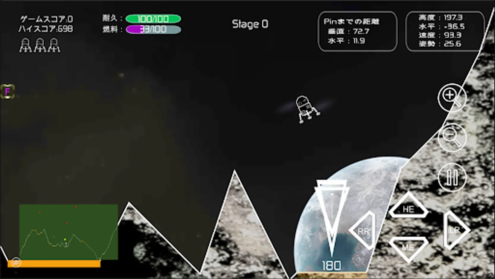 It is a moon landing game. Maneuver the lander well and land at the target point.