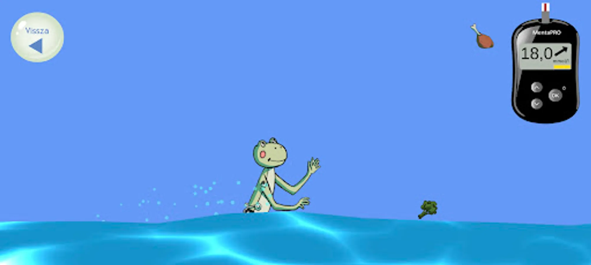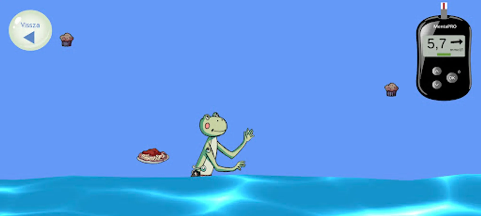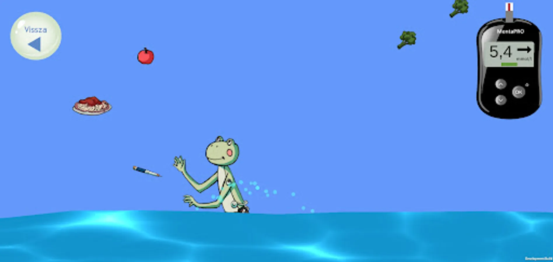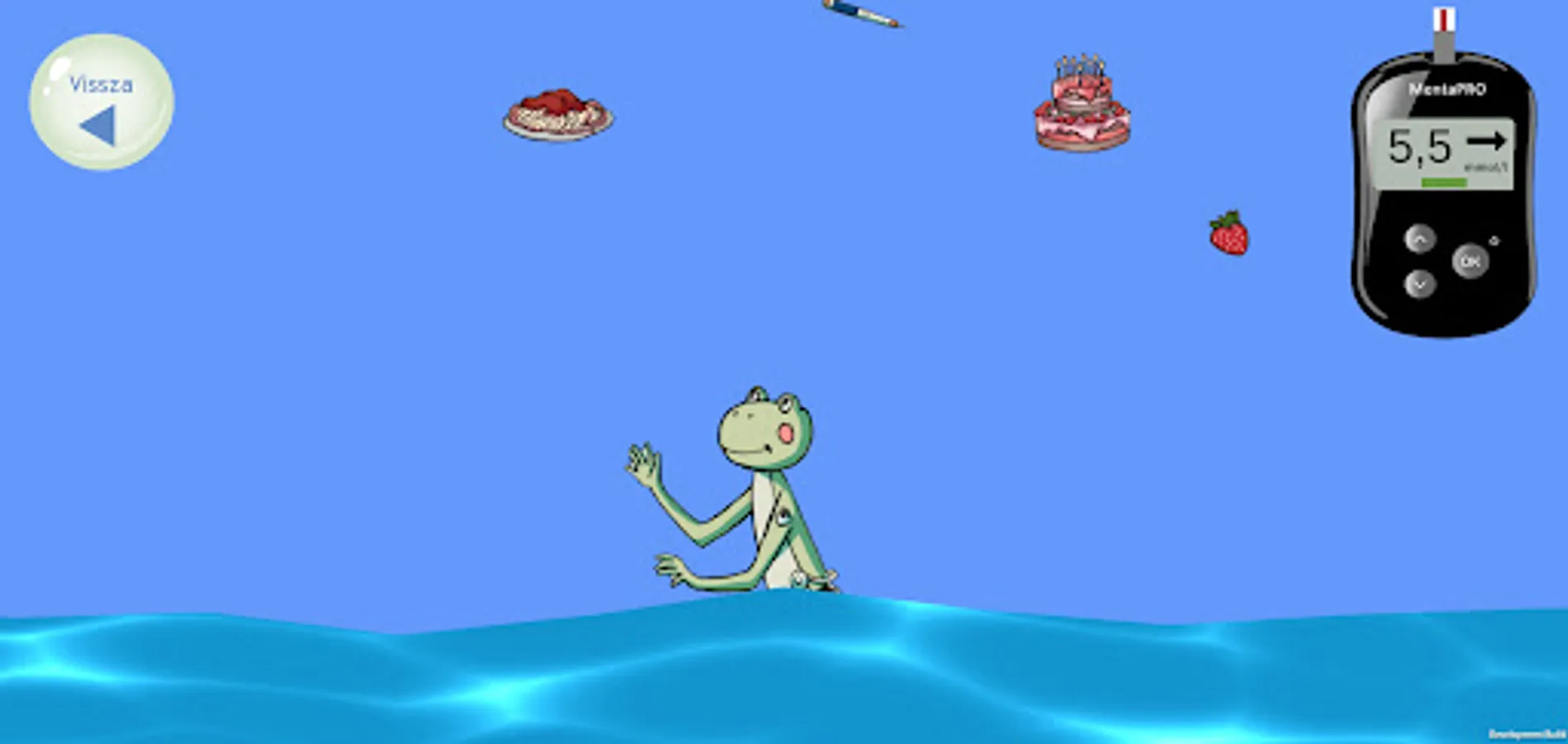Help MentaBéka maintain his blood sugar level: get enough insulin and food containing carbohydrates so that he can spend as much time as possible in a good range! The blood sugar meter helps: it shows the good range in green, if Menta's blood sugar level rises (yellow), she needs insulin, and if it falls (red), she needs to eat. If you don't succeed, it's okay - you can try again as many times as you like!
