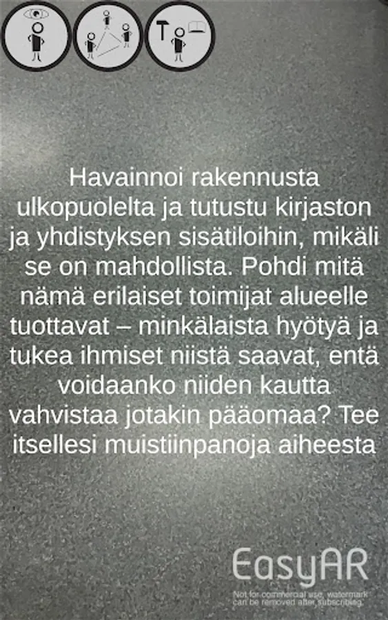AR area walk Varissuo takes the learner to Varissuo in Turku to examine and analyze the residential area from the perspective of social work and community work. The AR application guides you to look at, among other things, the structure of well-being and community, as well as the importance of environmental structures and services in the suburbs.