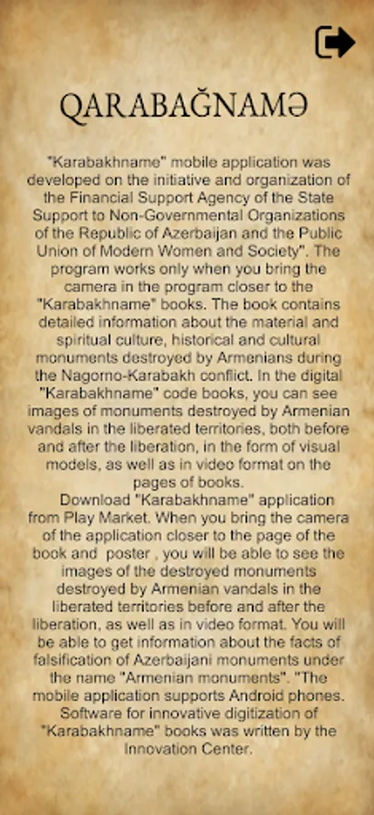 "Karabakhname" mobile application was developed on the initiative and organization of the Financial Support Agency of the State Support to Non-Governmental Organizations of the Republic of Azerbaijan and the Public Union of Modern Women and Society". The program works only when you bring the camera in the program closer to the "Karabakhname" books. The book contains detailed information about the material and spiritual culture, historical and cultural monuments destroyed by Armenians during the Nagorno-Karabakh conflict. In the digital "Karabakhname" code books, you can see images of monuments destroyed by Armenian vandals in the liberated territories, both before and after the liberation, in the form of visual models, as well as in video format on the pages of books.