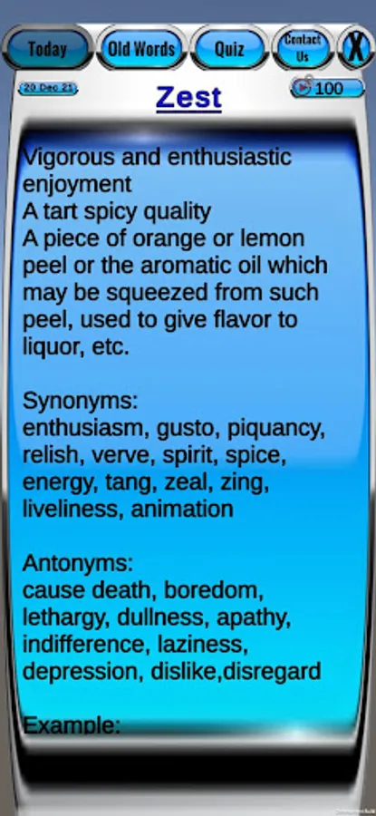 This application will be adding new words each and every day and there will be a quiz of 10 questions every sunday. Each word will have its meaning, synonyms, antonyms and example.