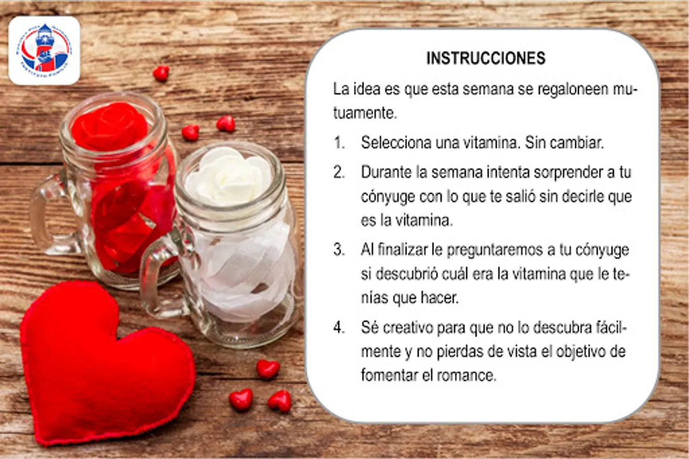 You must select a vitamin and for a week you will have to apply that vitamin to your relationship without telling your spouse so that in the end he / she discovers which vitamin was that you had to make. Give your 100% and allow it to be a special time.