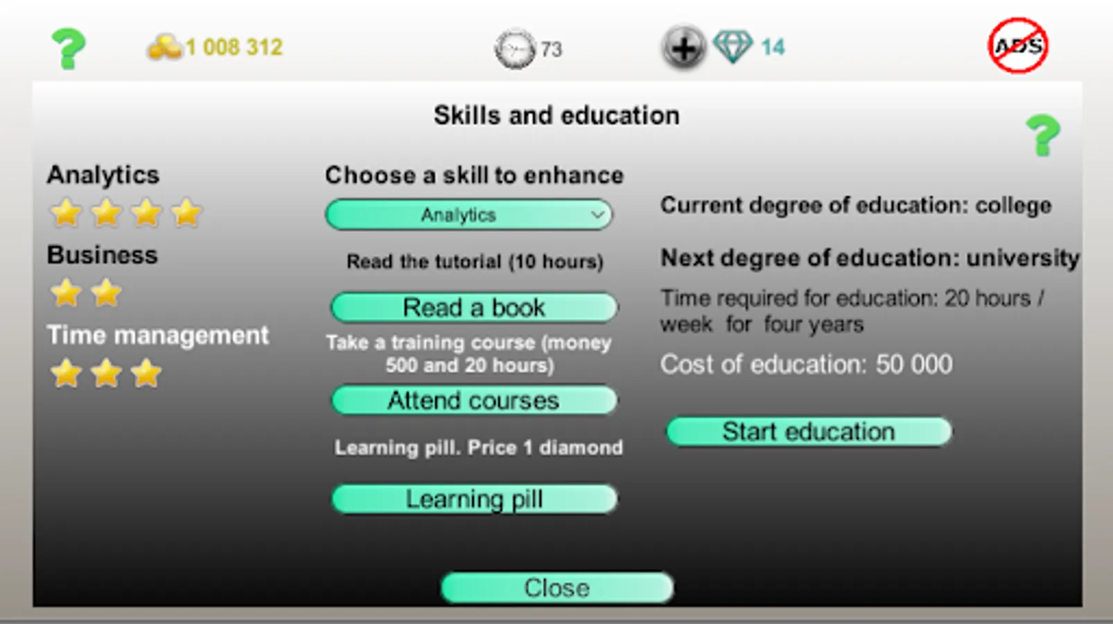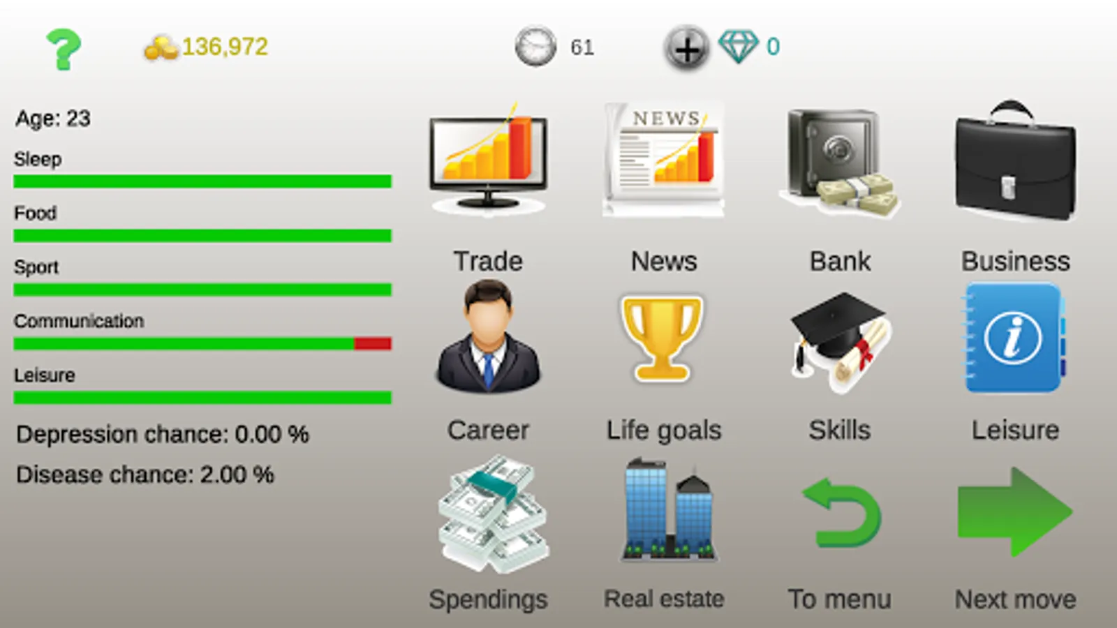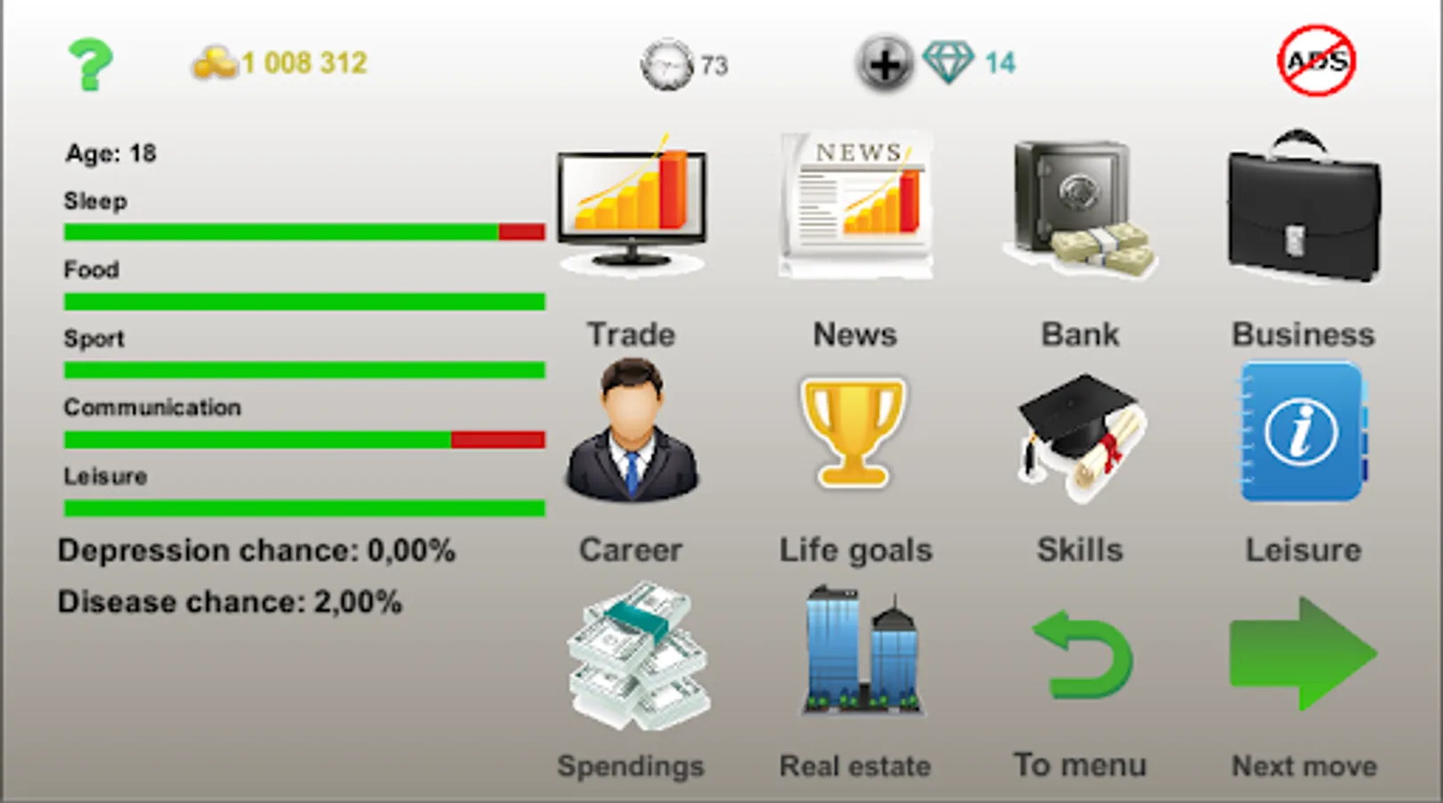 Keep track of the economy and news, analyze stock charts, find undervalued assets and choose the right moment for investment. Meet the vital needs of the character to avoid depression and health problems. Work as an employee, become freelancer or start your own business - the choice is yours! Start a business in different industries, with varying degrees of risk and return. Get an education, invest in real estate or business, develop your own skills to get an advantage!