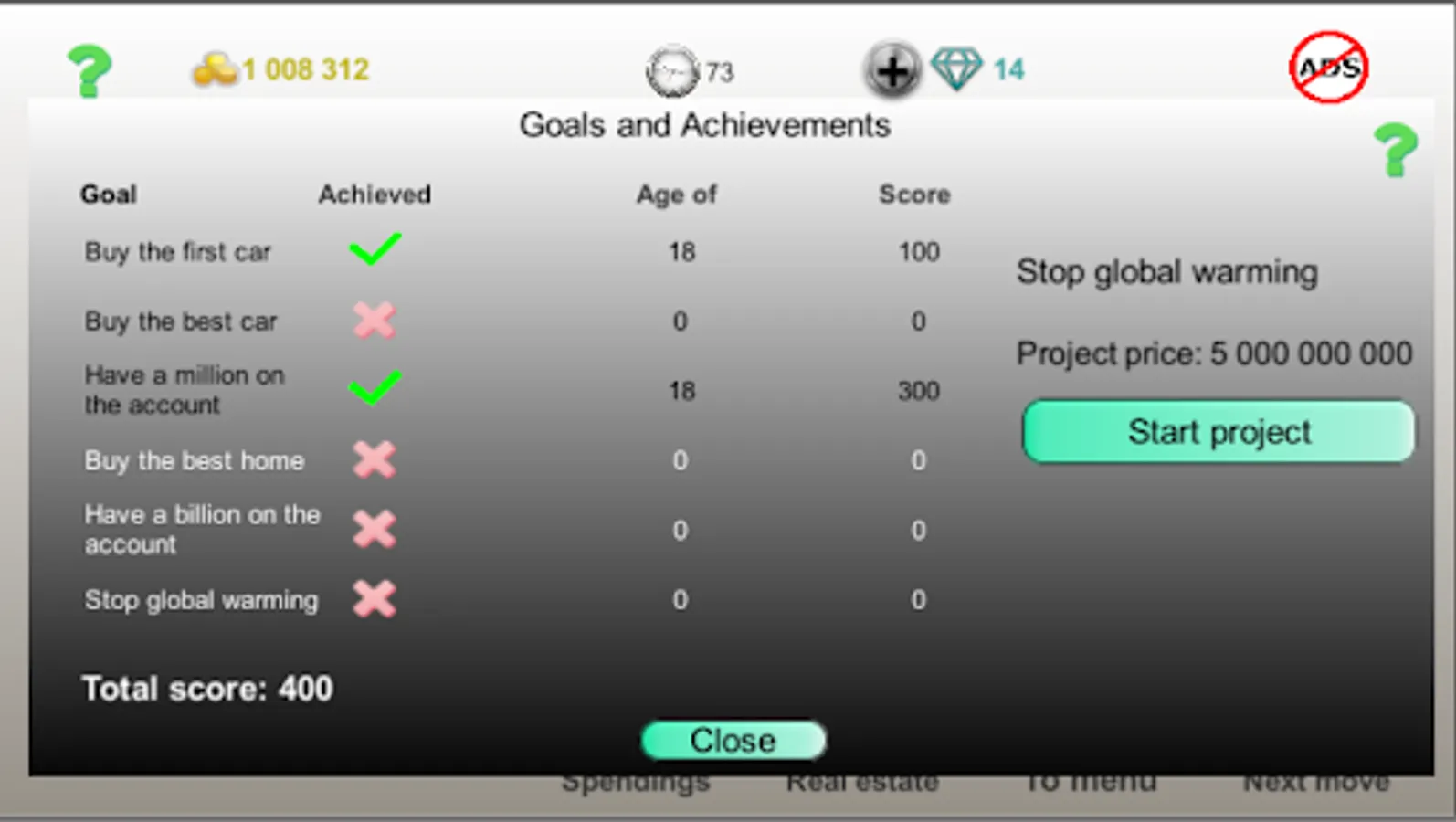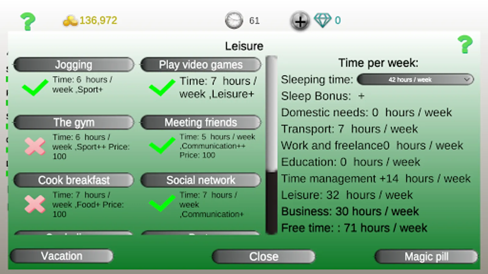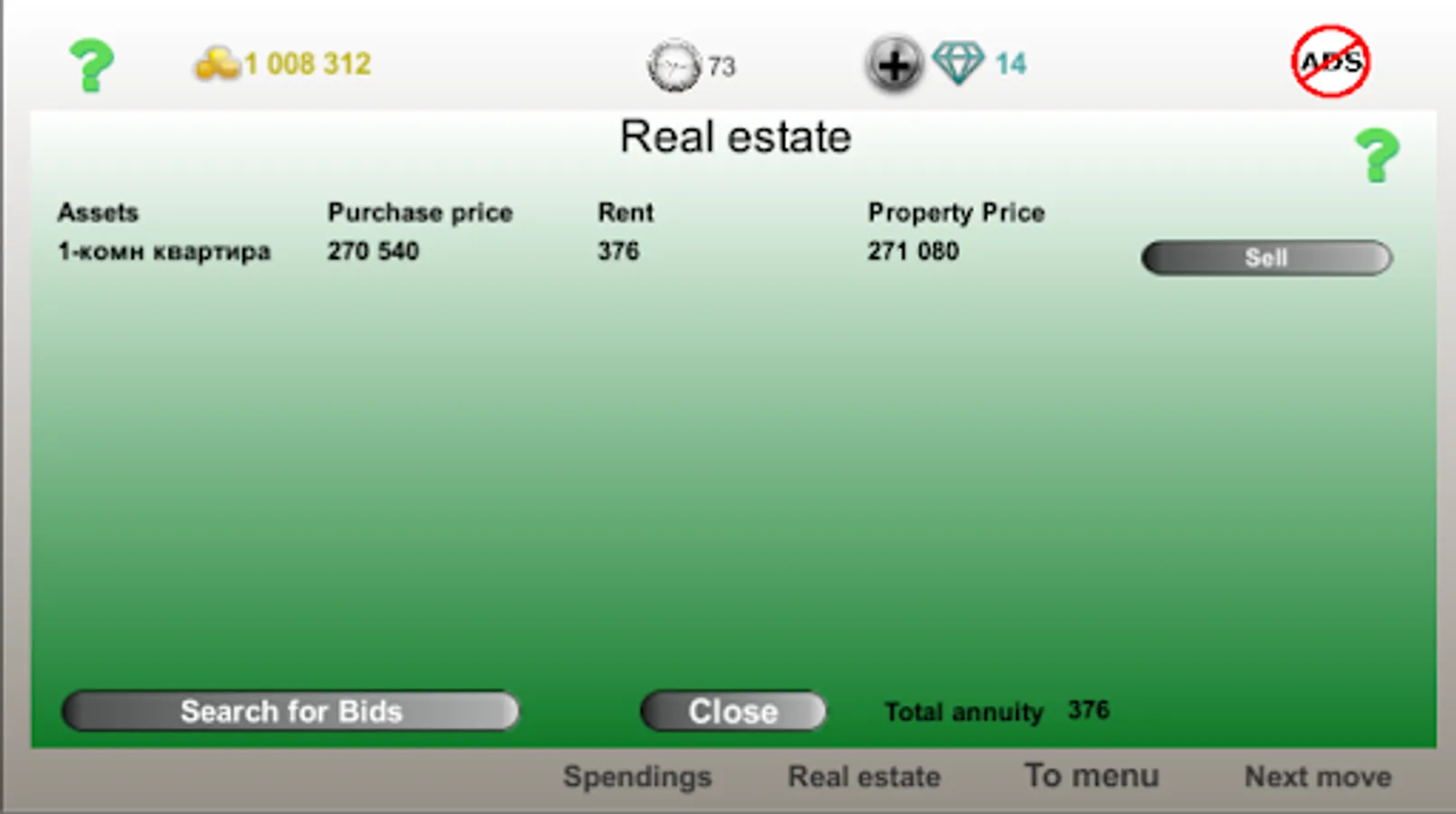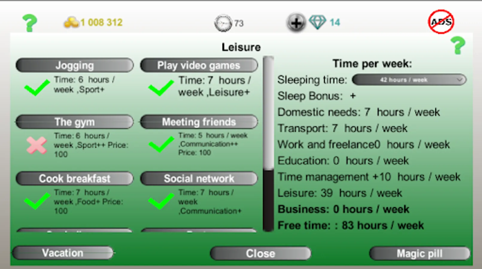 Keep track of the economy and news, analyze stock charts, find undervalued assets and choose the right moment for investment. Meet the vital needs of the character to avoid depression and health problems. Work as an employee, become freelancer or start your own business - the choice is yours! Start a business in different industries, with varying degrees of risk and return. Get an education, invest in real estate or business, develop your own skills to get an advantage!