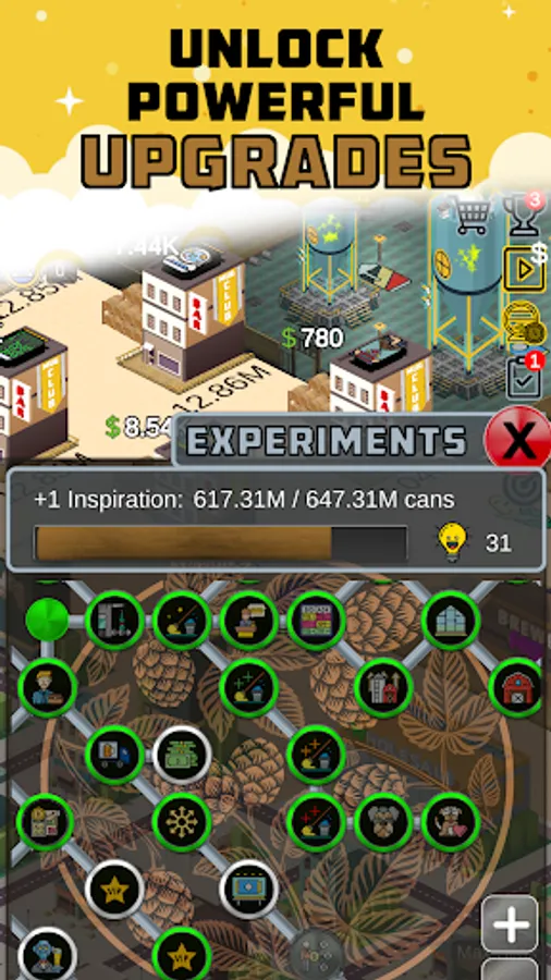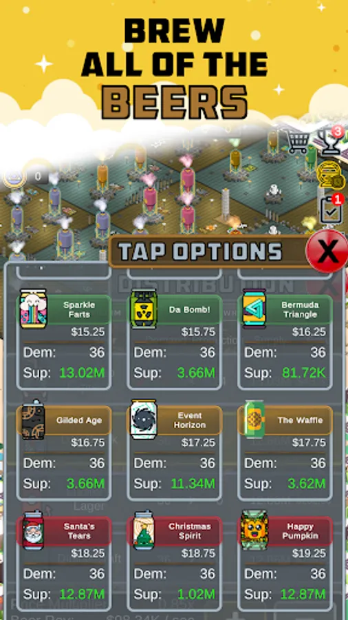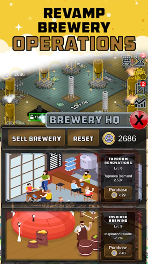 Grow your brewery and unlock permanent HQ upgrades by selling your successful brewery and reinvesting in a larger one. Unlock late-game experiments like robot bartenders, brewers guild membership, flagship beer selection, and more.