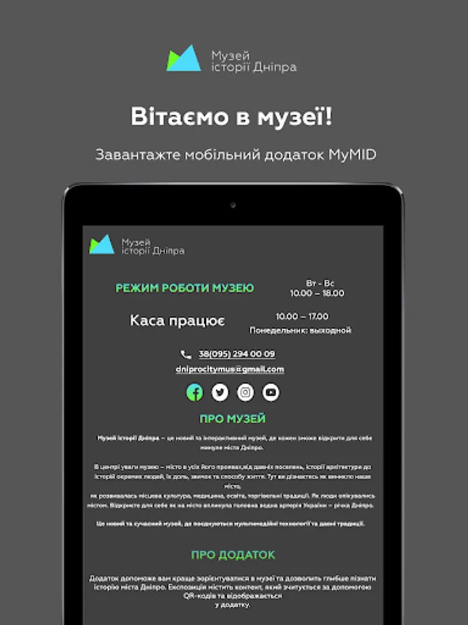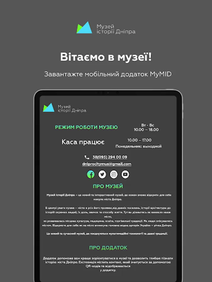 MyMID is a free application for the Museum of the History of the Dnieper, which will help you better navigate the museum and allow you to learn more about the history of the Dnieper. The exhibition contains content that is read by QR-codes and displayed in the application.