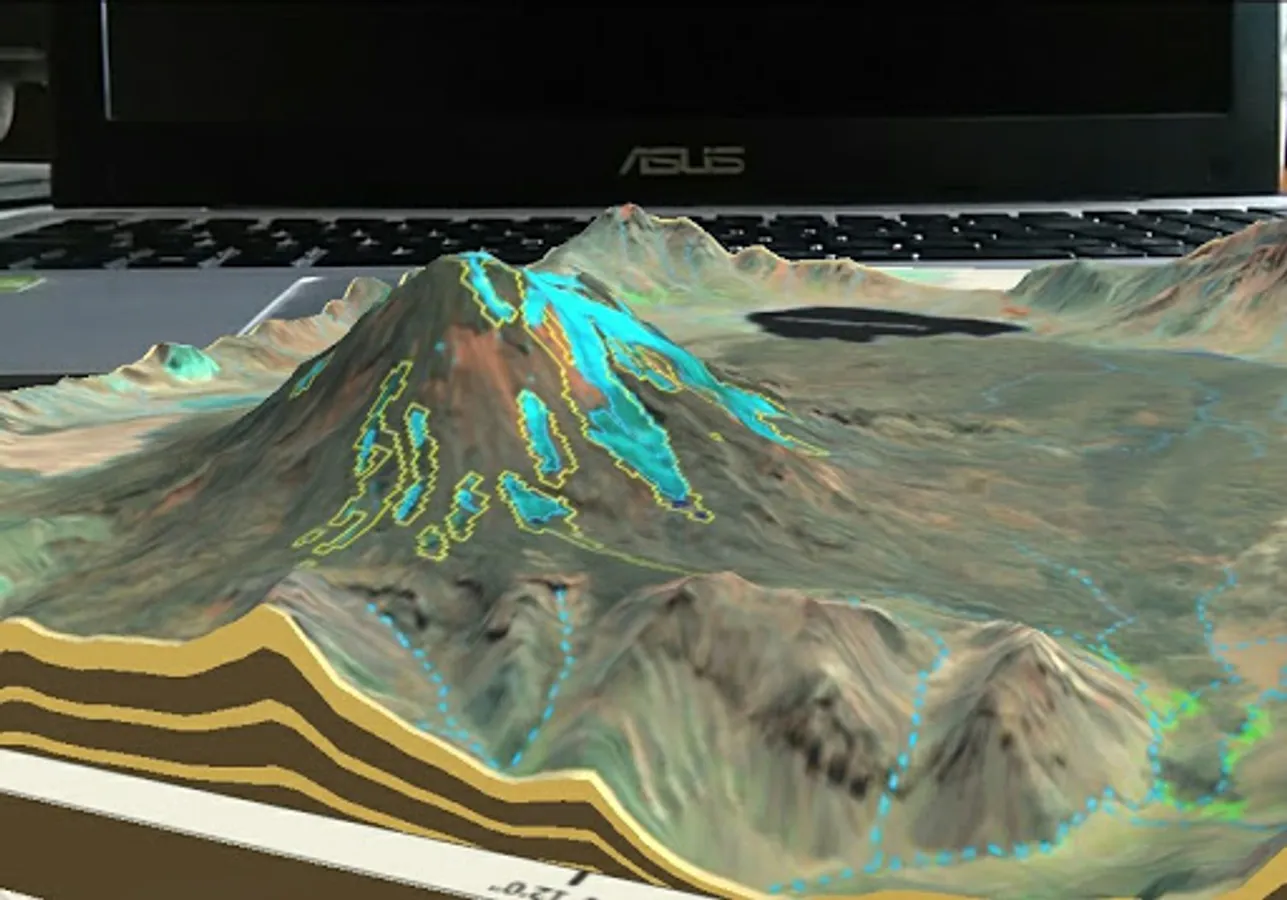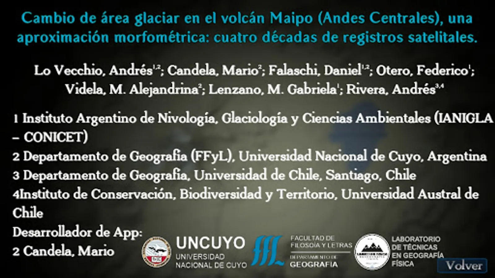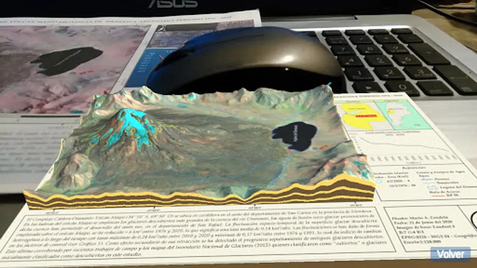 The Volcán Maipo RA application contains augmented reality technology through which the results of a scientific project entitled "Change of glacial area in the Maipo volcano (Central Andes), a morphometric approximation: 4 decades of satellite records are exposed." From the Laboratory Chair of Physical Geography Techniques, Department of Geography (FFyL), National University of Cuyo, Argentina.