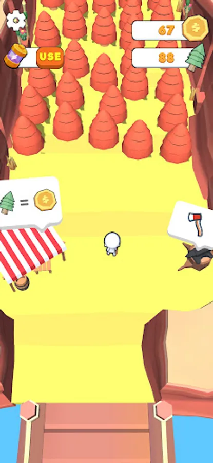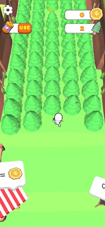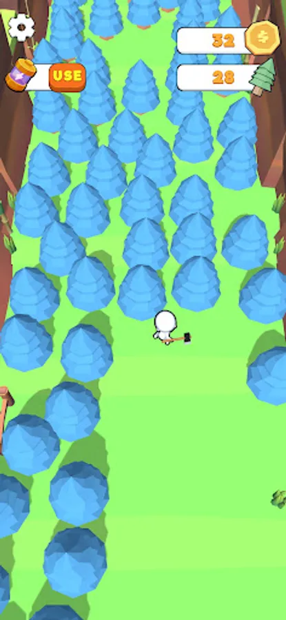 Follow the path of wood and chop down as many as you can! Sell the wood to the market and buy new upgrades to speed up your wood chopping process.