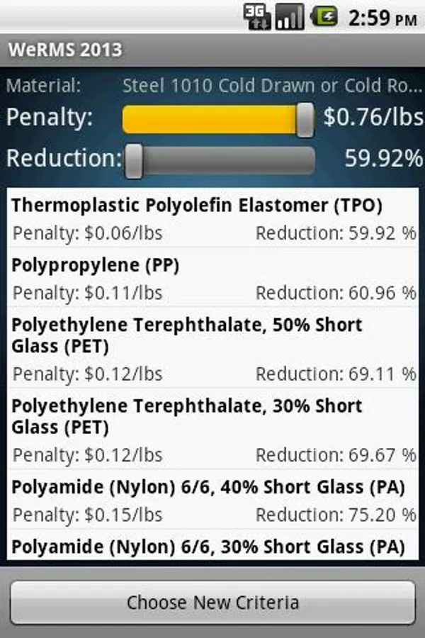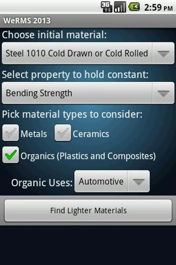 This app is a comprehensive material selector which will consider a material of construction, and based on one of several available structural translations, perform an analysis which will identify the best path for saving weight in a part or structure. A set of calculations are performed to identify the relationship between cost increase and ultimate weight saving in percent. This system provides sliders used to determine which material systems are the early solutions (minimum weight saving at minimum cost penalty or even maximum cost savings) and which substitutions will provide the largest percentage weight saving at the greatest cost penalties.
