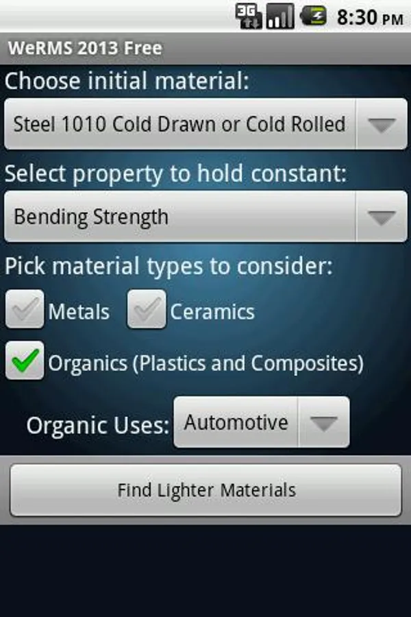 The Weight Reduction Material Selector (WeRMS) is a tool which can help you make your design lighter. If your part or assembly is too heavy, simply enter the material it is made out of, the structural property you would like to keep constant, and the types of materials you are willing to consider as replacements into WeRMS. WeRMS will then generate a list of materials which can reduce the weight in your design and tell you about how much money each material will save or cost you per pound. WeRMS is a simple way to generate a lot of quick ideas for weight reduction. The free version of the app shows all the results, but hides the names of the cheapest third of the materials and the lightest third of the materials.