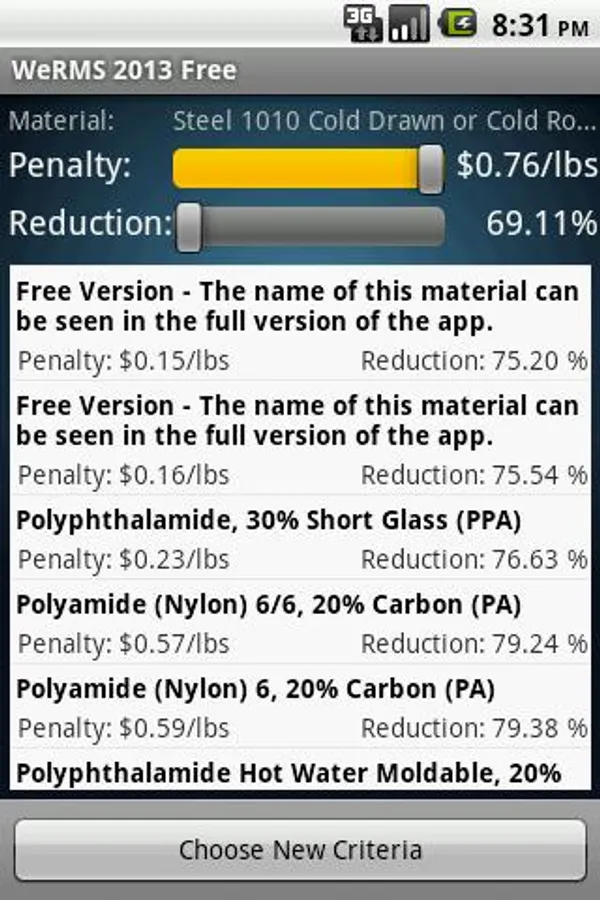 This app is a comprehensive material selector which will consider a material of construction, and based on one of several available structural translations, perform an analysis which will identify the best path for saving weight in a part or structure. A set of calculations are performed to identify the relationship between cost increase and ultimate weight saving in percent. This system provides sliders used to determine which material systems are the early solutions (minimum weight saving at minimum cost penalty or even maximum cost savings) and which substitutions will provide the largest percentage weight saving at the greatest cost penalties.