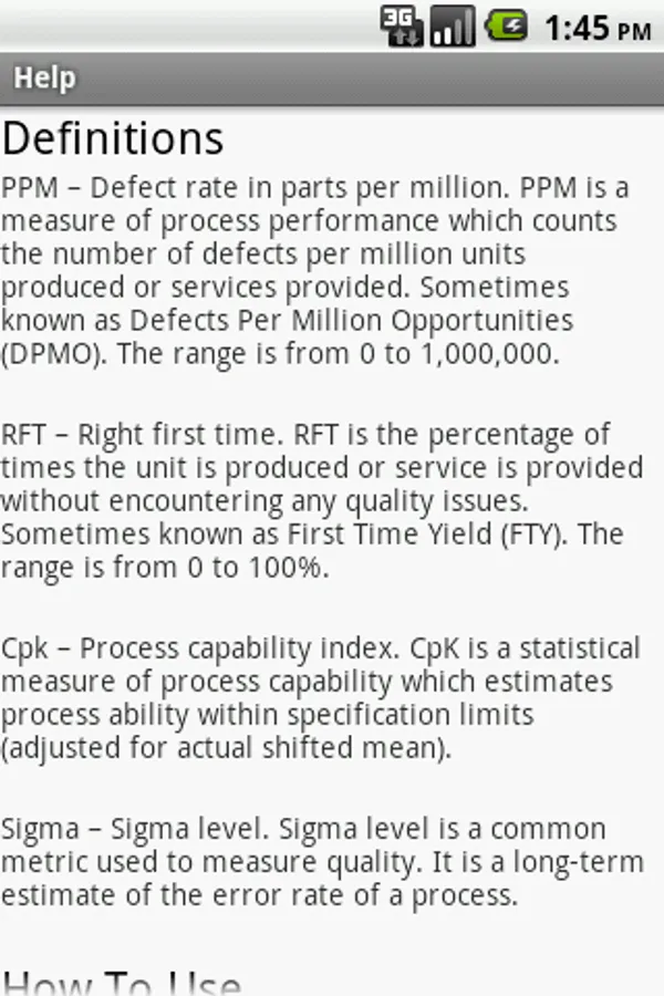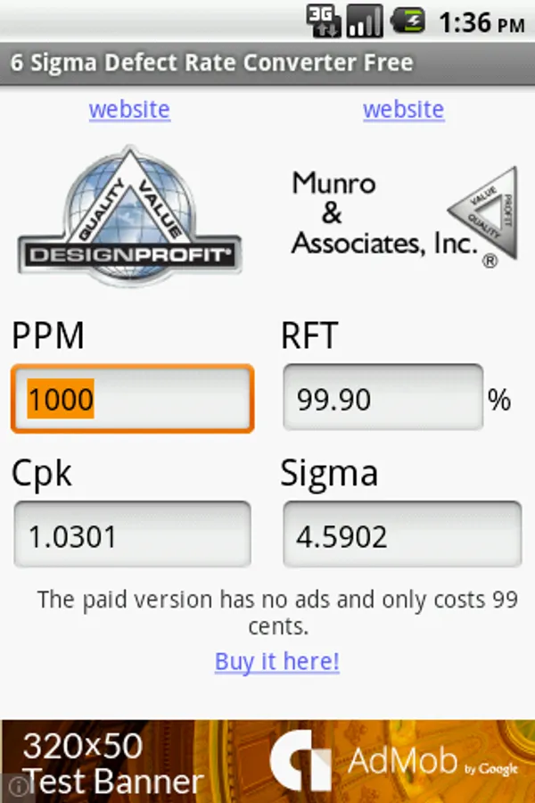 The Six Sigma Defect Rate Converter Free Version can determine any three of Defect Rate in Parts Per Million (PPM, also called Defects Per Million Opportunities or DPMO), Process Capability Index (Cpk), Right First Time (RFT, also called First Time Yield or FTY), or Sigma level from the other one.
