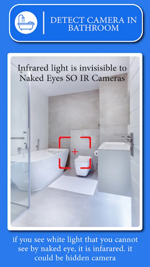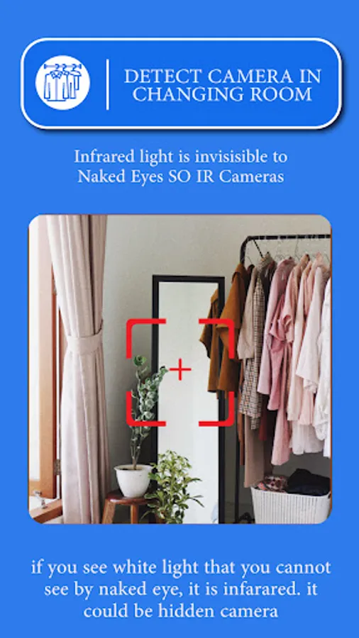 This hidden spy camera app has one more tool which is detect infrared lights. just open the IR detector and scan for white light that appear on screen but not visible by naked eye. such white light indicate infrared light. it could be infrared camera.