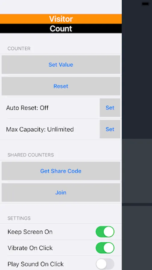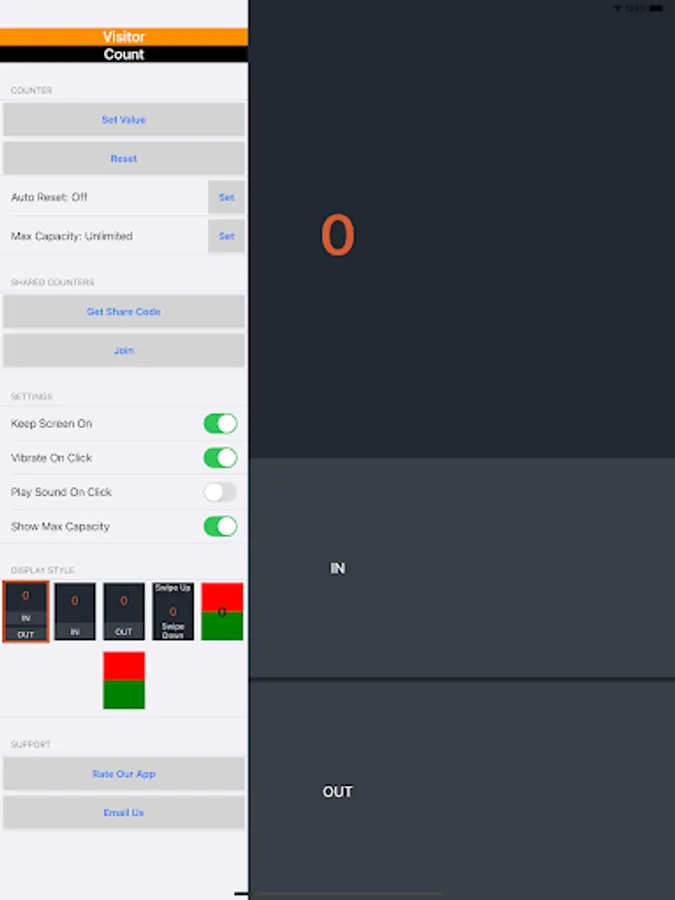 Visitor Count is simple counter, simply click "In" when a customer enters, and "Out" when a customer leaves. The app will keep a running total indicating how many visitors you have at a time.