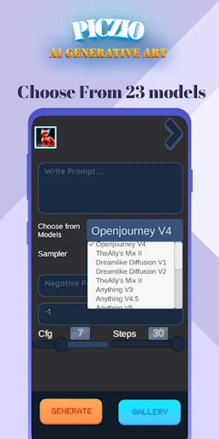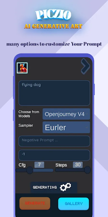 Piczio empowers you with advanced creative options to refine and perfect your artwork. Utilize features like Seed, Sampler, Negative Prompts, Cfg (Configuration), and Steps to fine-tune the generation process. Tailor every detail to ensure your art truly reflects your vision. Experiment, iterate, and unlock new levels of artistic expression.