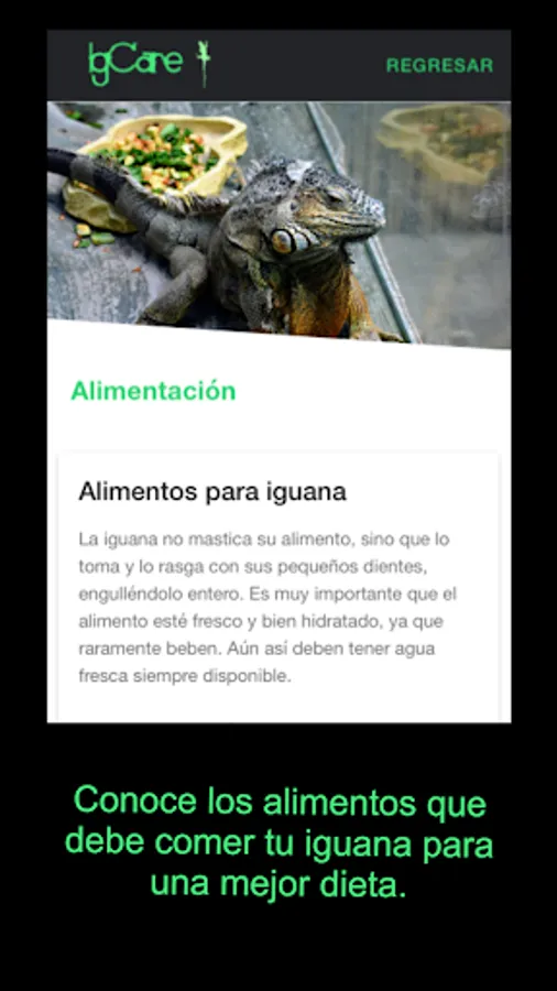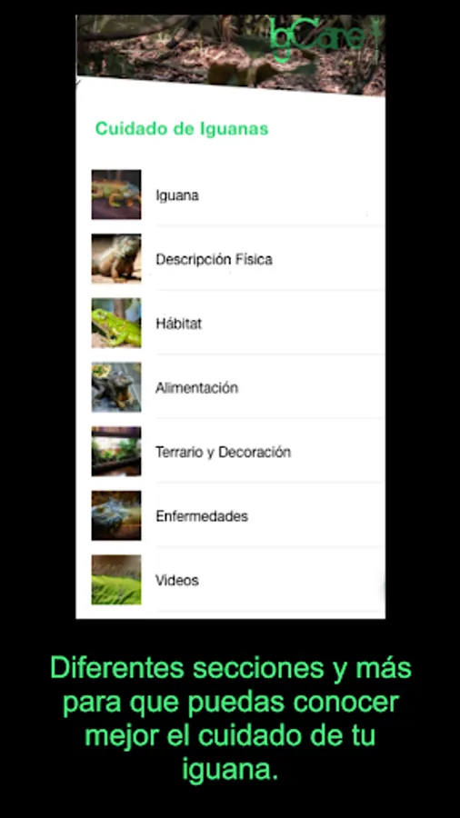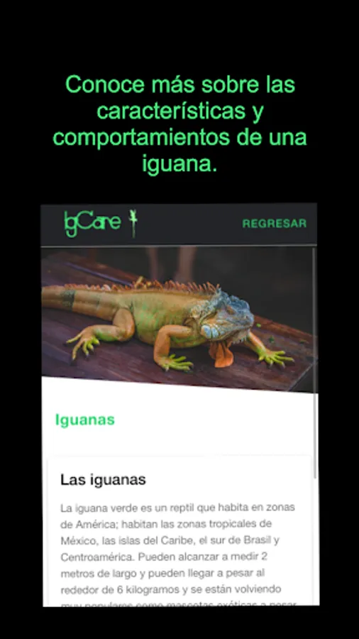 IgCare is a guide to know the characteristics of an iguana, it contains information for the care and maintenance that you must have as a pet as well as the food and requirements necessary to prevent disease.