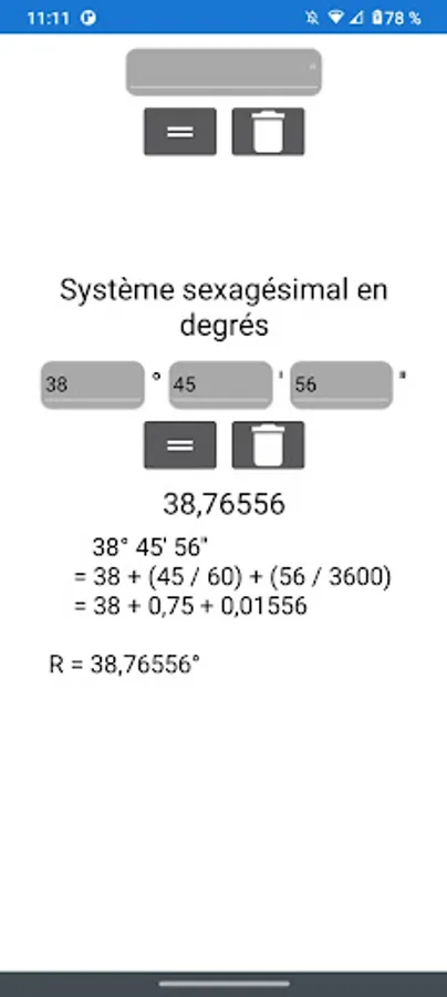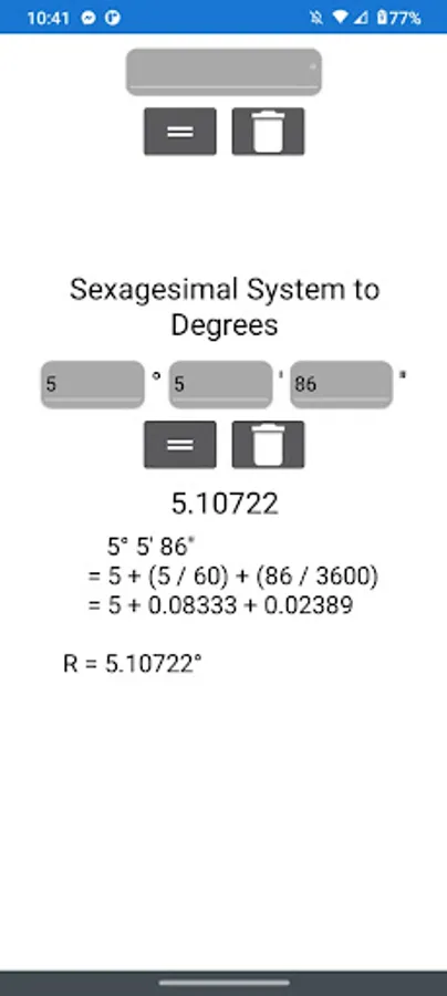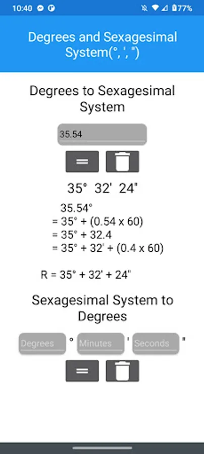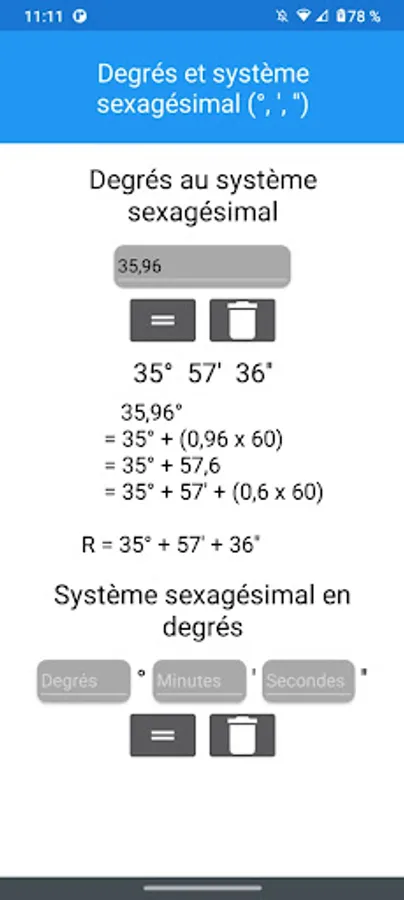 Convert degrees to the sexagesimal system and from the sexagesimal system to degrees with the procedure