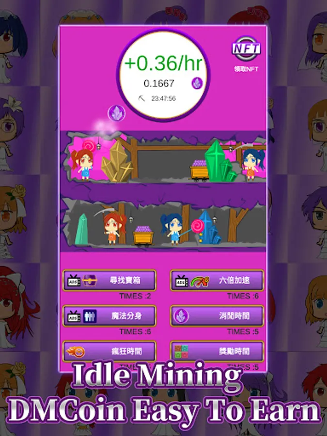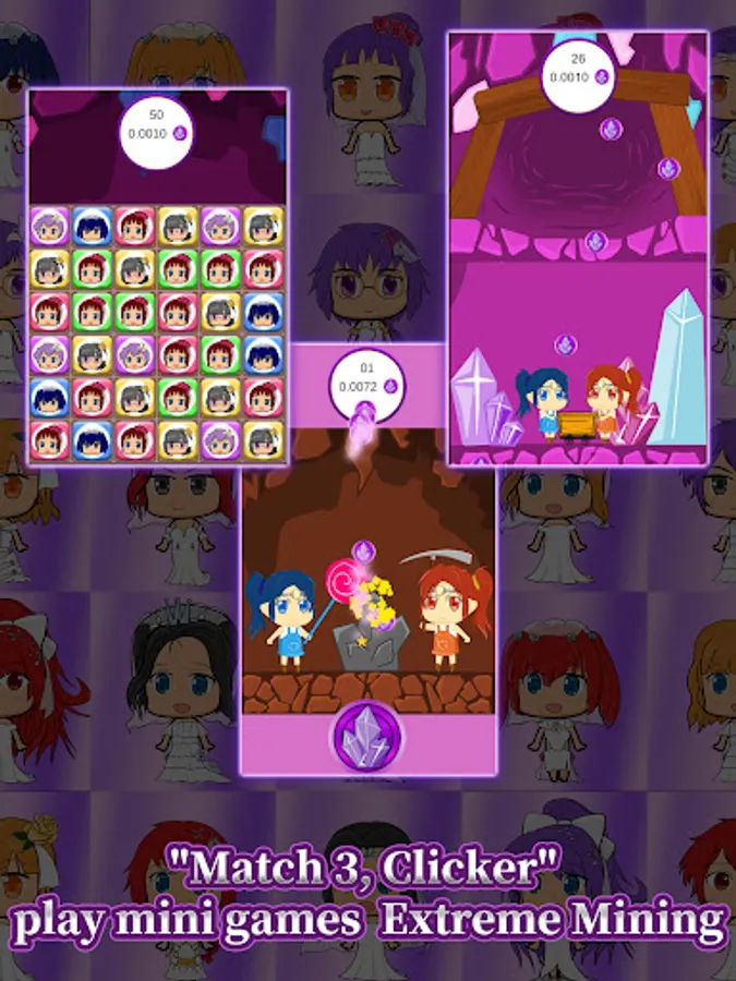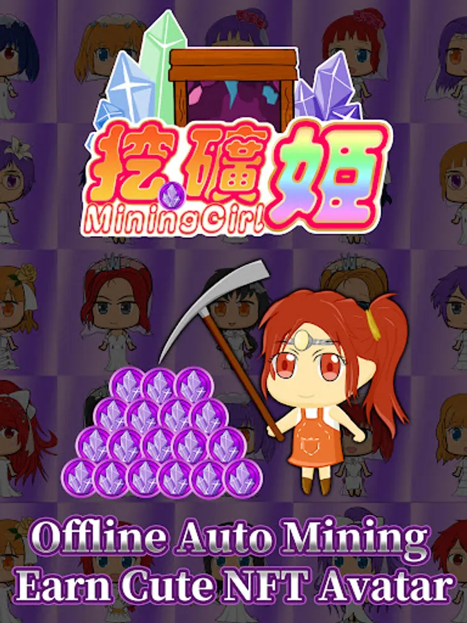 "Mining Girl" is an Offline Auto Mining - Earn NFT Avatar mobile game with the theme of cute girls. Players only need to go online for a few minutes every day to easily turn on the offline automatic mining function that does not consume mobile phone resources, and earn daily cute girl wedding dress NFT Avatars in thousands of styles. If you want to speed up the mining of 「DMCoin」, you can play a variety of mini games including "Match 3, Clicker"etc., which will greatly increase the amount of 「DMCoin」 obtained.