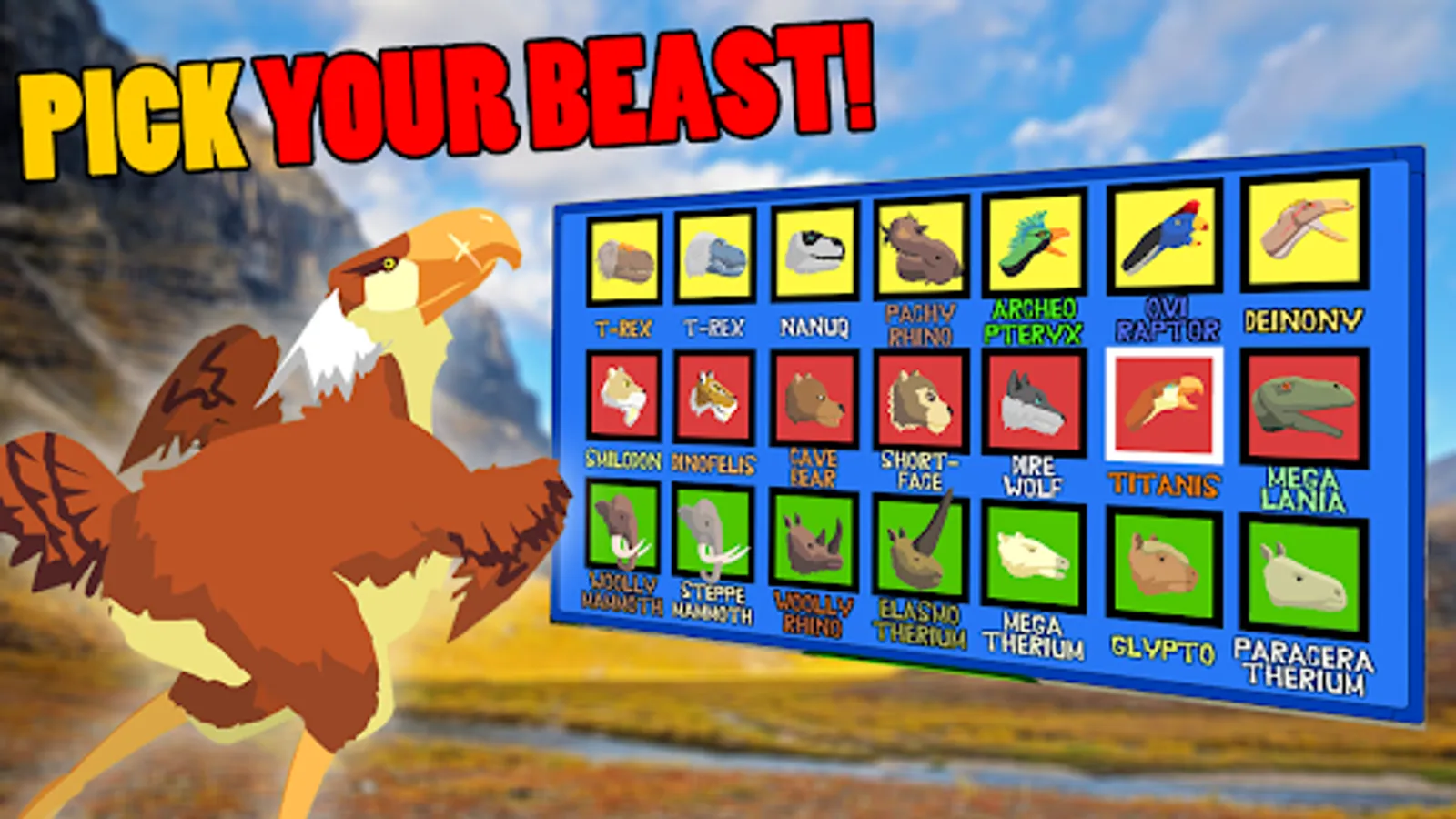 - Pick up to 14 different dinosaurs and beasts from T-Rex, Mammoth, Elasmotherium, Megalania to Glyptodon and Megatherium