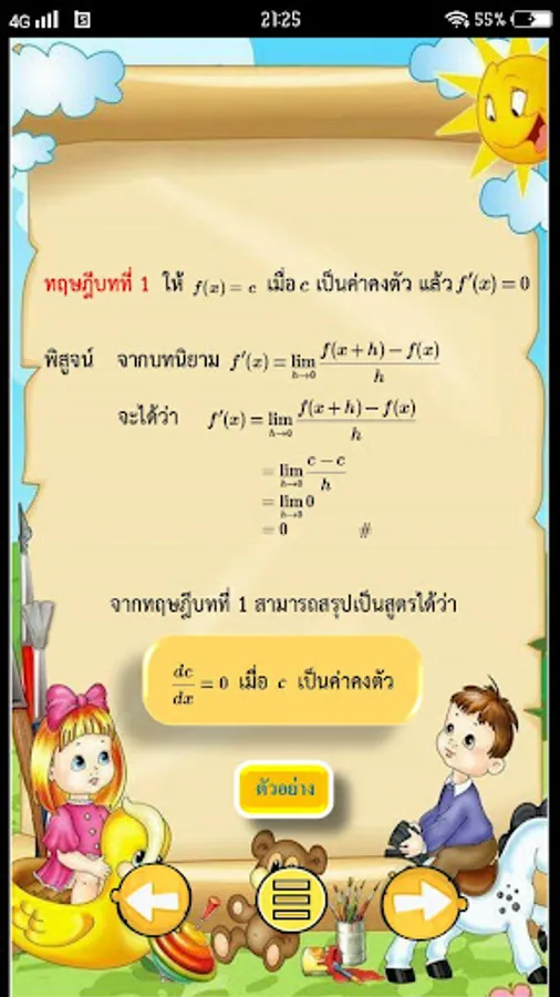This developed game application for practicing basic finding skills has compiled a total of 16 basic derivative formulas, which are the content of calculus courses at the upper secondary level. There are functions for learning along with examples and game functions. Knowledge testing With the format of the game being the right or wrong answer And answer matching games with problems