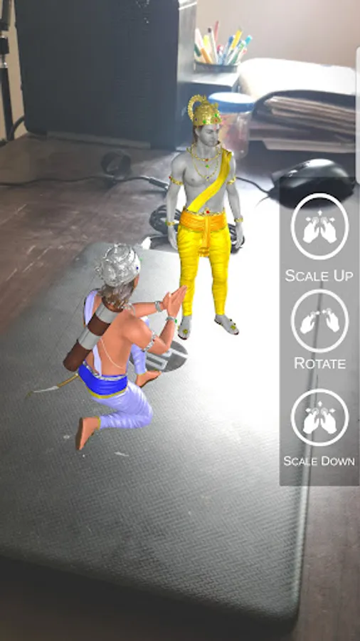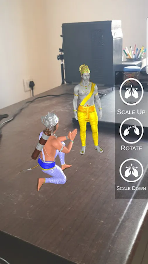 This app brings Krishna and Arjuna into your real-world environment using Augmented Reality. The scene is taken from Bhagavat Geetha of Mahabharata. Krishna advice Arjuna in the Kurukshetra field sharing high level of philosophical information. The seven representative verses from Geetha is selected in this rendering. This selection is called the Sapta Sloki Geetha. This will help the users to familiarize themselves with Bhagavat Geetha in an innovative way using AR Holograms.