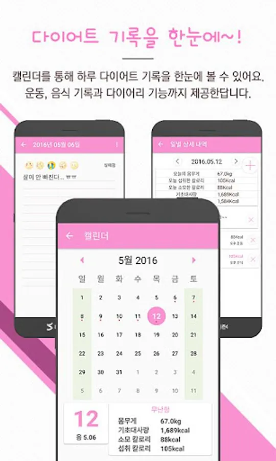A. (Diet) Record: Goal management, calorie intake of the day, calories burned, weight change, and pedometer are displayed at a glance. The recorded values can also be seen at a glance in Menu> Calendar.