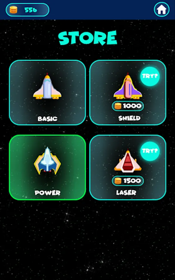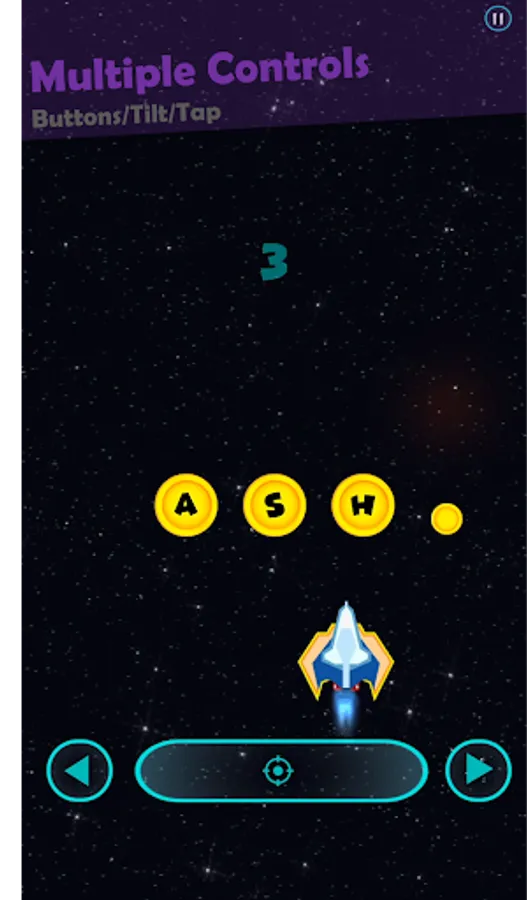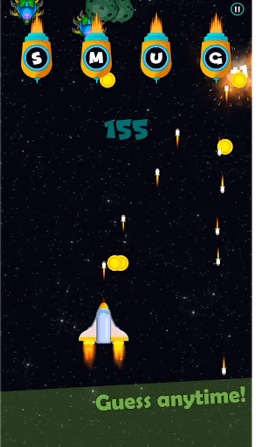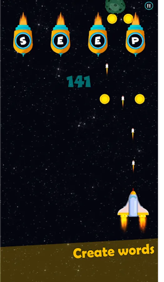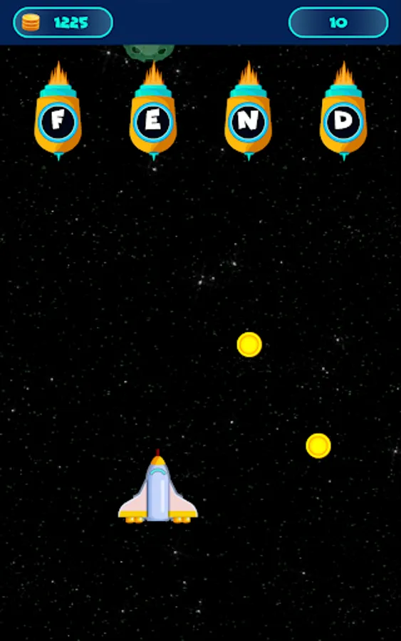 Your space ship is going on a long journey and you need to make way by shooting down enemy ships. Each enemy ship has a letter on it and you can only shoot down an enemy ship if the letters on the remaining enemy ships make a valid English word. If you shoot at an incorrect letter, a shot is fired back towards your ship and you need to avoid it. You can collect coins when a three letter word is created.