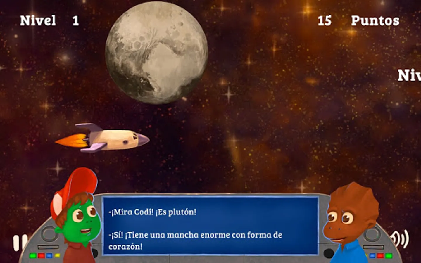 It is a casual platform game, with a space theme, where a couple of young adventurers travel through space looking for their way back home. During their journey, they must dodge obstacles and discover things about the planets of the solar system.
