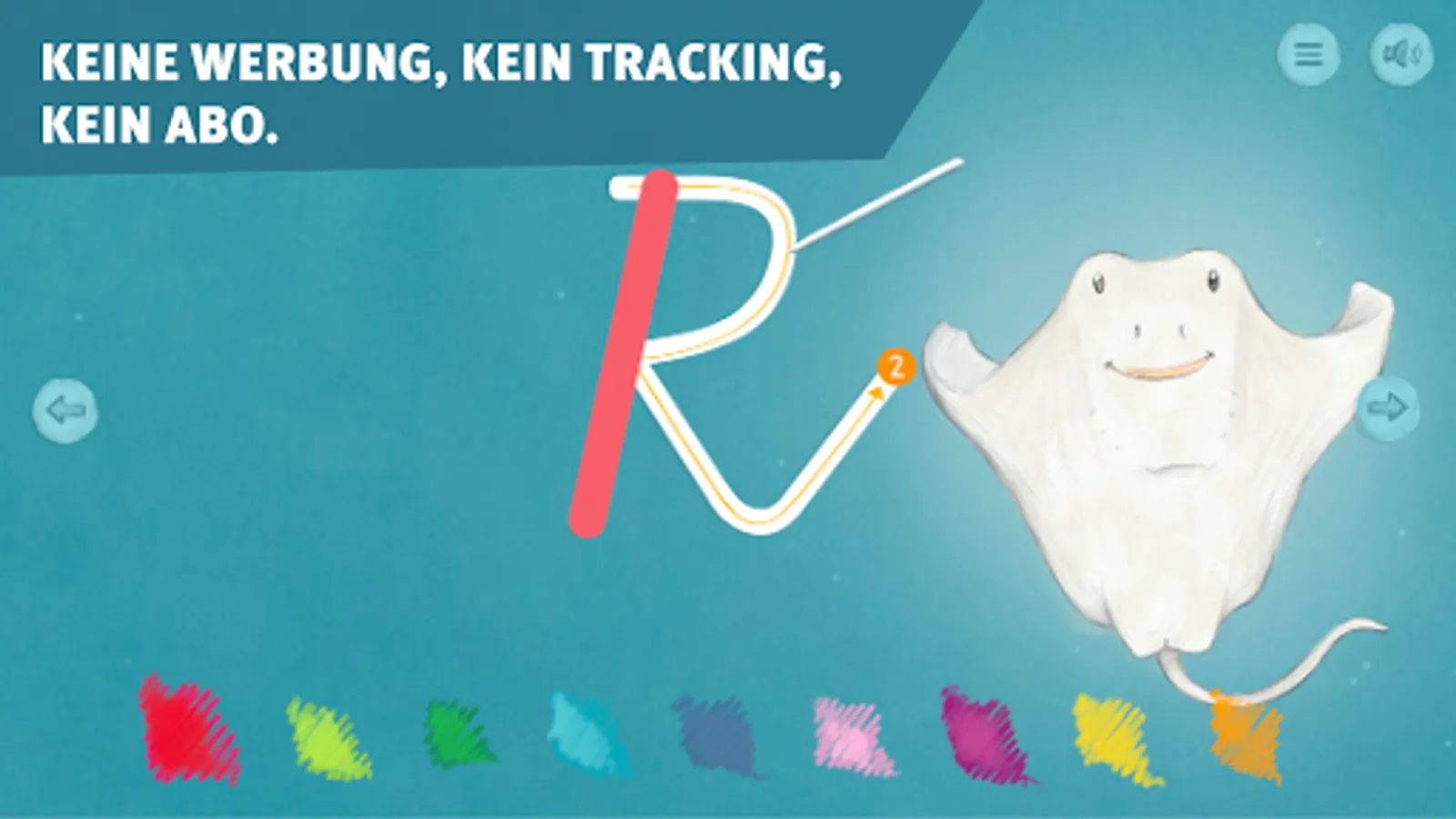 Animated selection menus support the open story. Your child can continue dreaming the adventures of the lion child Lu while learning to write. There are different pen colors to choose from, highlighted with your own tones - a hidden mini-game. Depending on the speed, there are up to three pineapples to be won. Coins and leaderboards were deliberately avoided in order to offer motivation appropriate to the age and not to promote gambling-like profit conditioning.