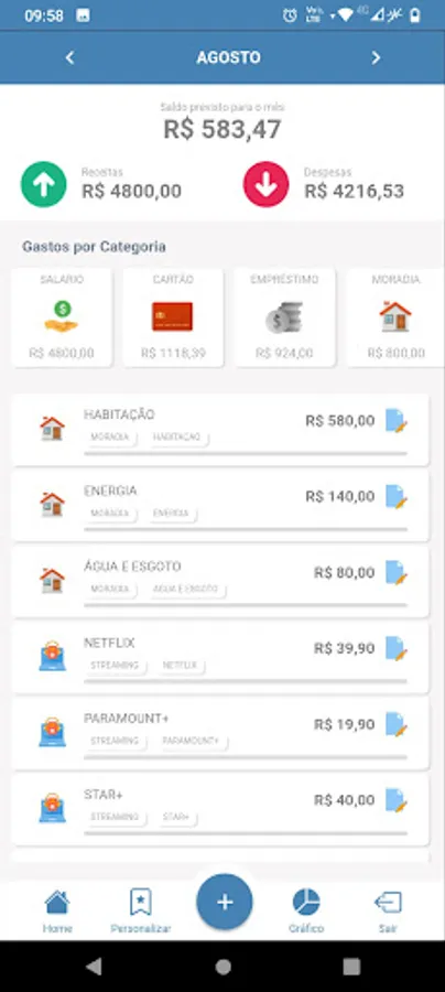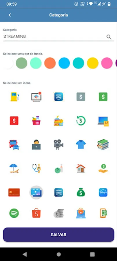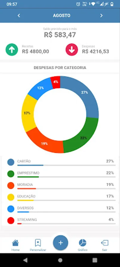 When opening the application, the user can add a new transaction and fill in the necessary information, such as value, date and category. The application allows you to create custom categories so that the user can organize their transactions the way they prefer.