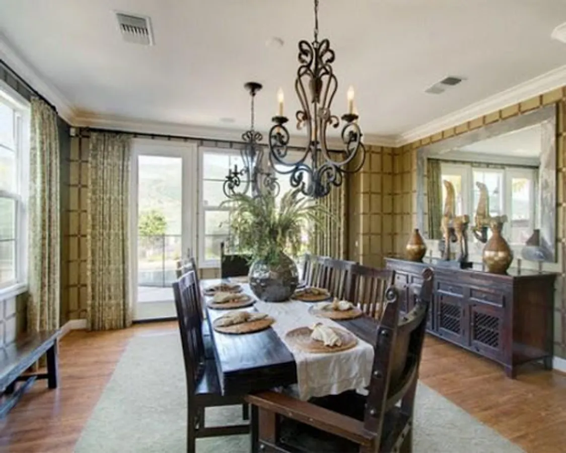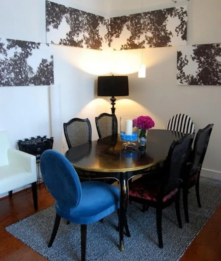A rich floral drapery will stand strong with a black table and will introduce and match your accented hues of amber that you accessorized earlier with. It will also add the accents of brown, coral, and amber. If you add leaves to the table, it will elongate it into a more formal state. With your table and draperies in their proper place, it is finally time to add your rug. A subtle rug with a grid of black, brown, and sandy colors will beautifully tie into the dining room area. Use of nylon fibers are best as they are easiest to care for.