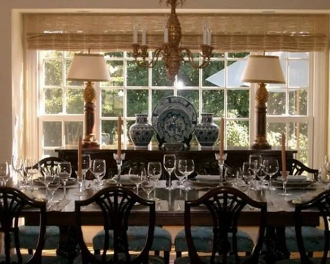 Whenever you decorate a dining room, you need to compose a compelling place setting so that your guests are able to focus on their food and conversation, not on being uncomfortable in an empty room. You can use various nick knacks on your china cabinets to liven things up. You can even take a few huge empty soda bottles and fill them with floral arrangements for just a few bucks.