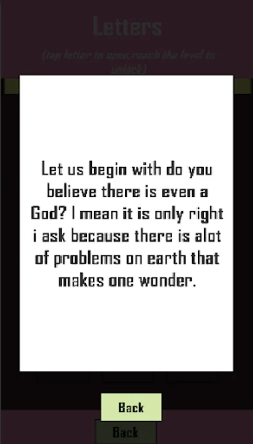 In this game, I addressed what I believe to be inconsistencies and mind-warping stories/myths as to God but most importantly, why are humans suffering if there is a deity that is so powerful enough to stop the suffering at once but nothing is done.