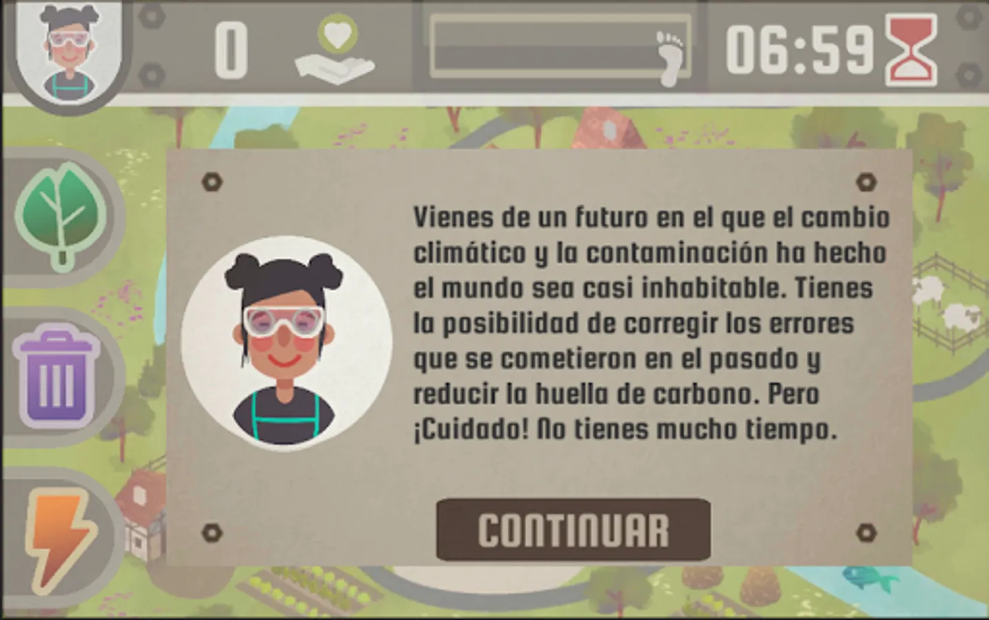 You come from a future in the world that is almost uninhabitable due to climate change and pollution. You have the possibility to correct the mistakes that were made in the past and reduce the carbon footprint. But beware! You do not have much time.
