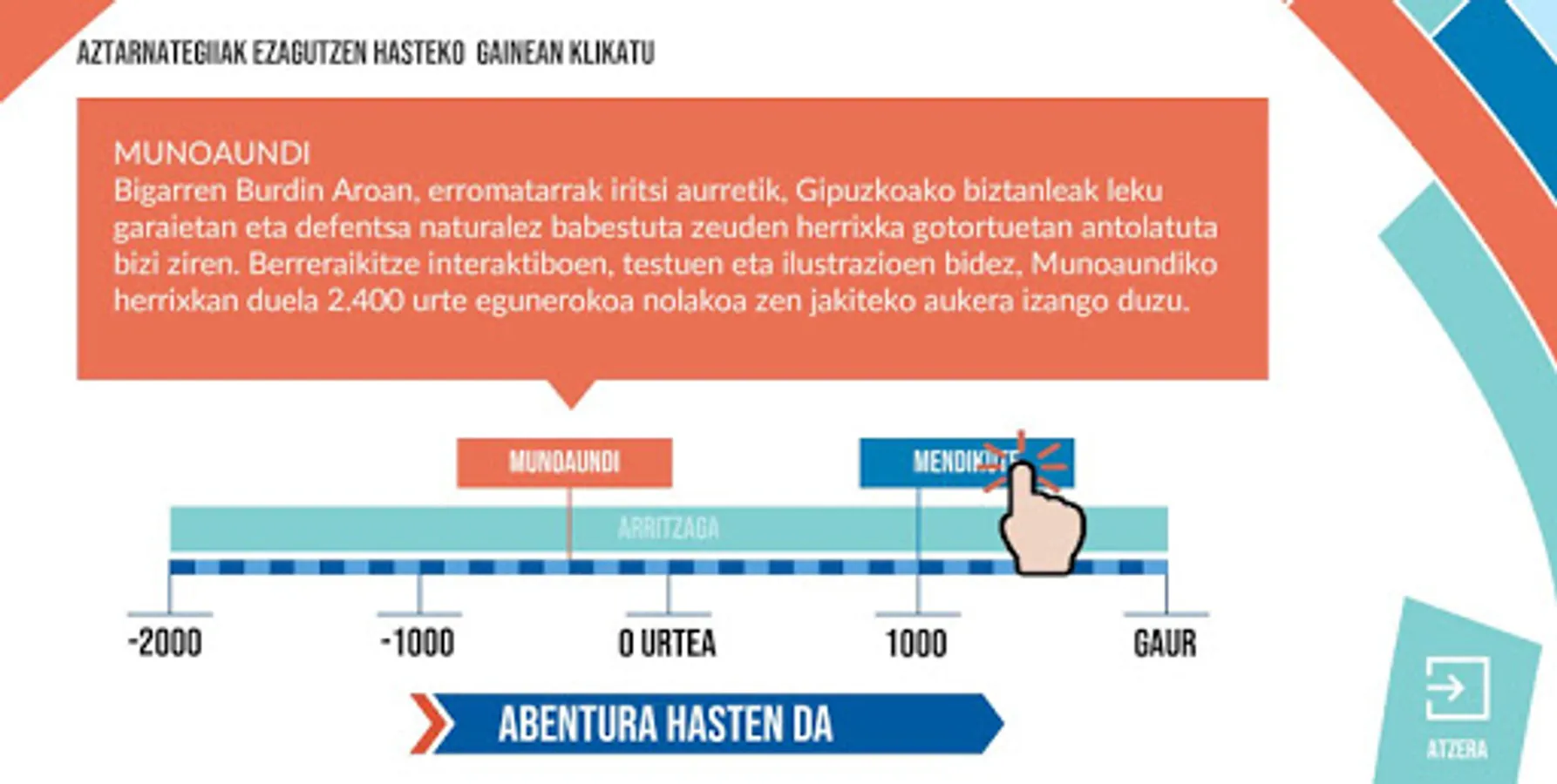 MUNOAUNDI. During the Second Iron Age, before the coming of the Romans, the people who settled Gipuzkoa lived in fortified hilltop settlements with natural defences. Using interactive reconstructions, texts and illustrations, discover what everyday life was like in the settlement of Munoaundi 2,400 years ago.