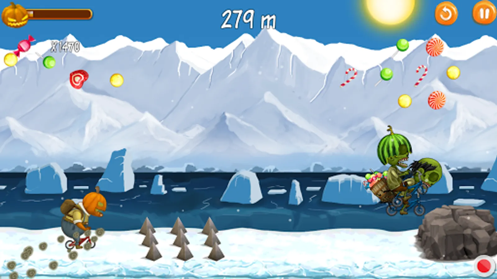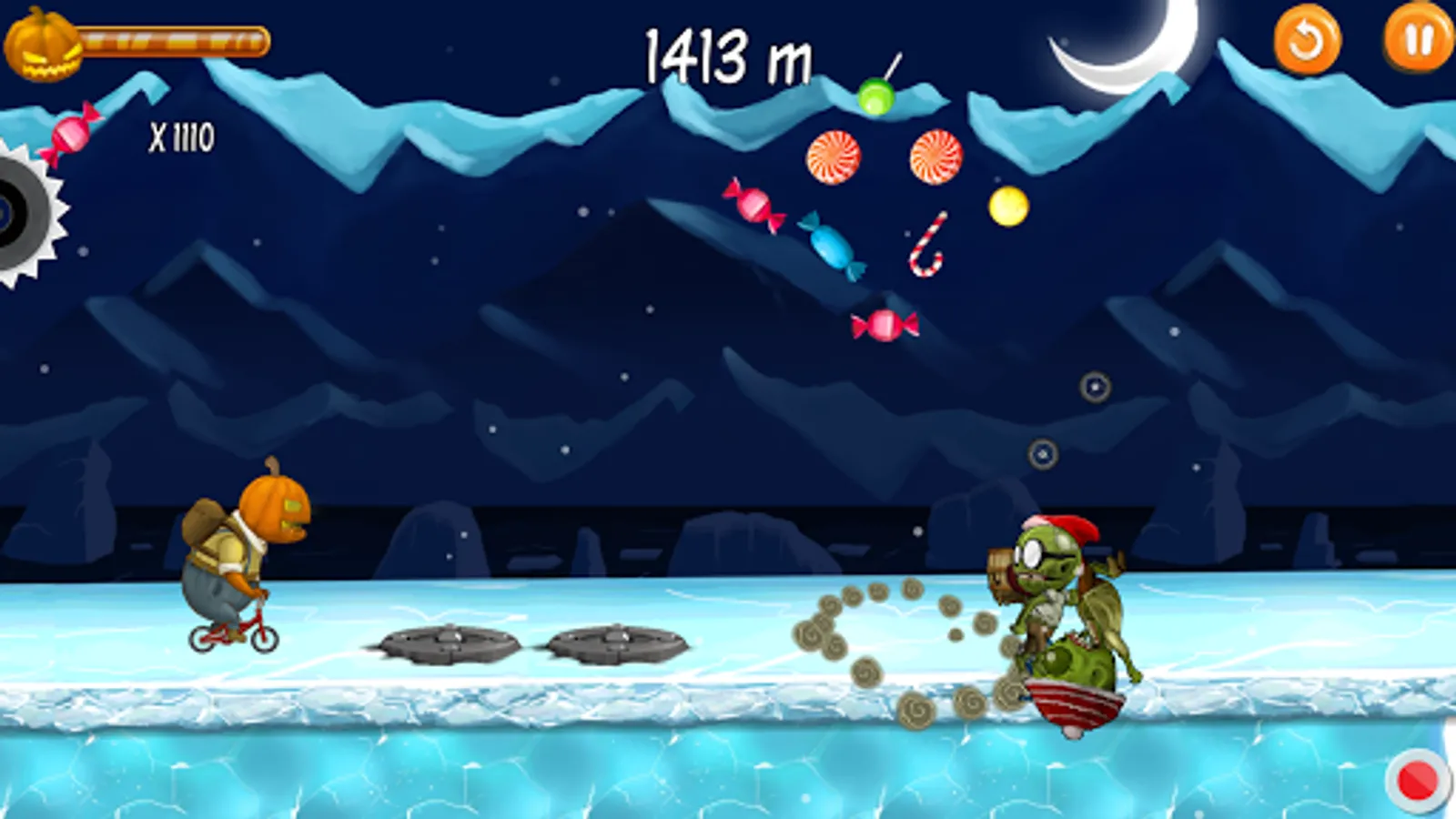 There are many different zombies, some run by feet, some do zombies skating and some are zombies biking. There are many obstacle along the way, you need to tap to keep the bike flying or release it to keep the bike running on the ground to collect candies, hit zombies and avoid obstacles.