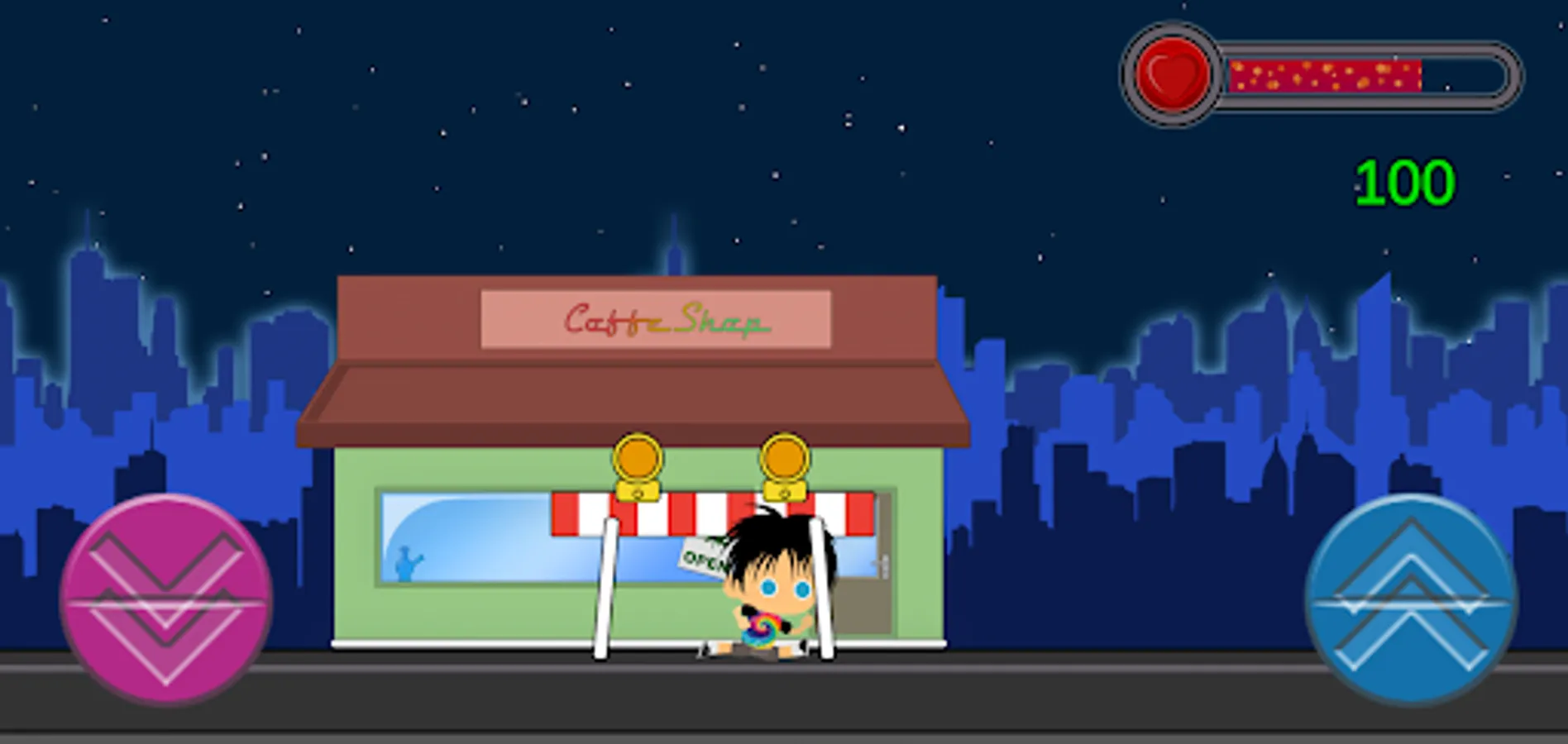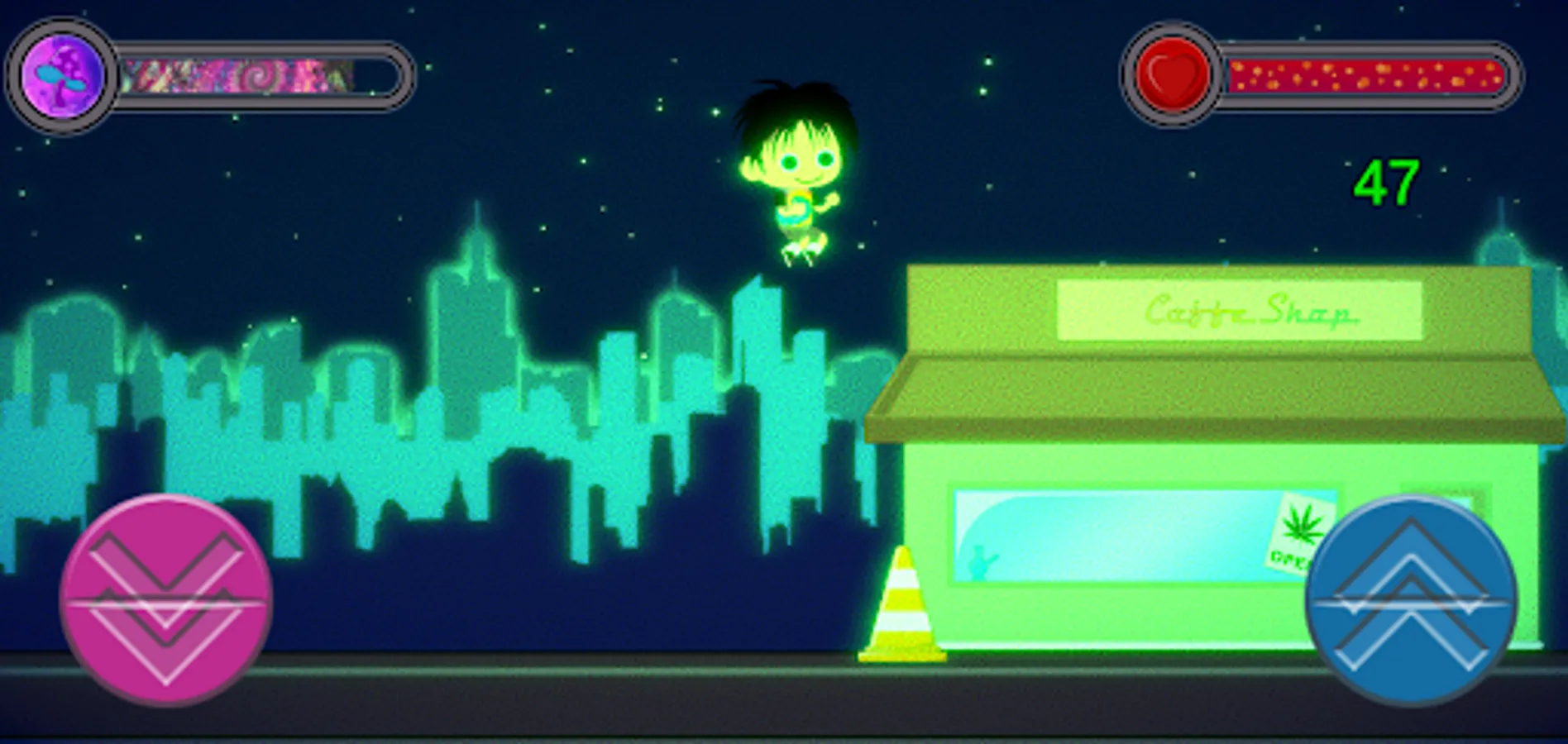 On your home you are taking drugs. Drugs have realistic effects and cost you health. You also have to evade street objects on your path. This endless jump and run if for casual gaming in the train or bus. Have Fun!