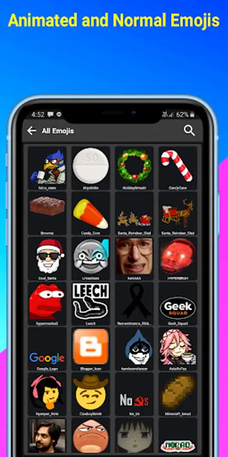 This app provides you Awesome, Newest, custom emojis Unlimited collection of emojis for Discord, Twitch and Slack