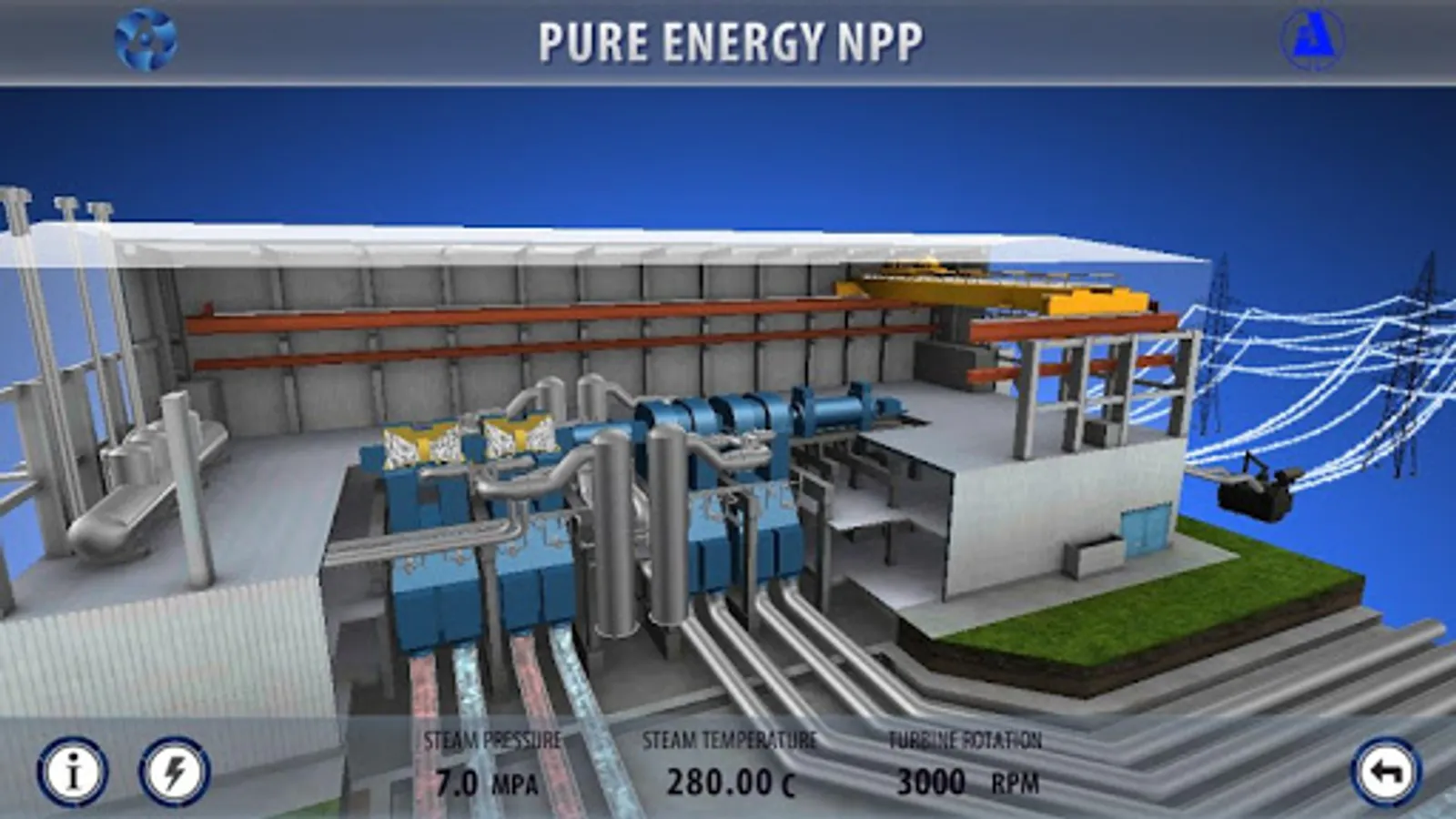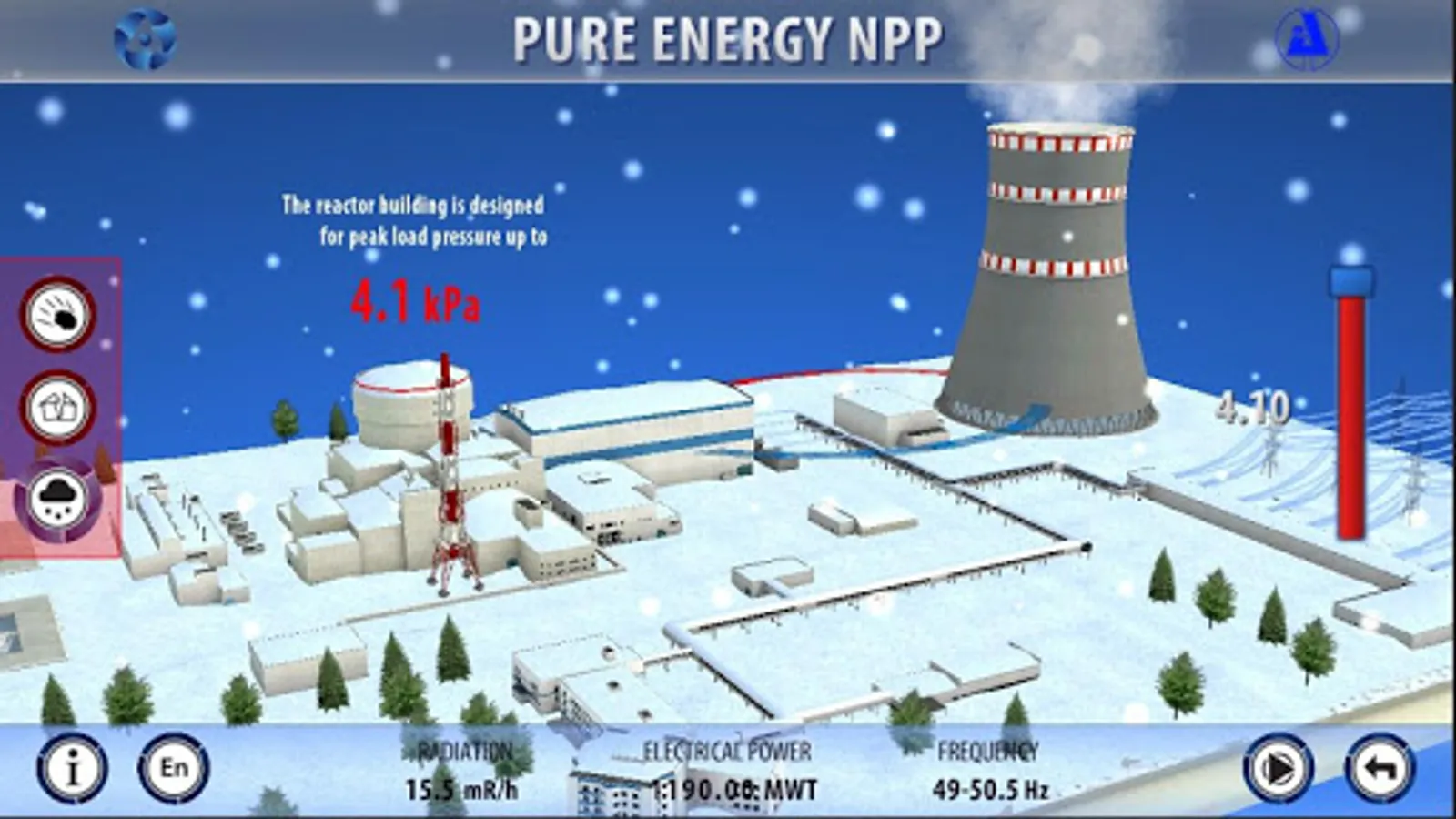The application makes it possible to become familiar with the design and the power generation technology on the contemporary nuclear power plant of the Russian design of 3+ generation. It shows the resistance to the extreme external influences (earthquake, explosion and falling of flying object, snow loads) in the interactive mode and also with the operation mode of the security systems in the emergency mode (rupture of the pipeline). It gives a possibility to the user to stop and to start nuclear reaction. The application is based on technological solutions of the project «AES-2006», developed (created) by JSC «ATOMPROEKT».