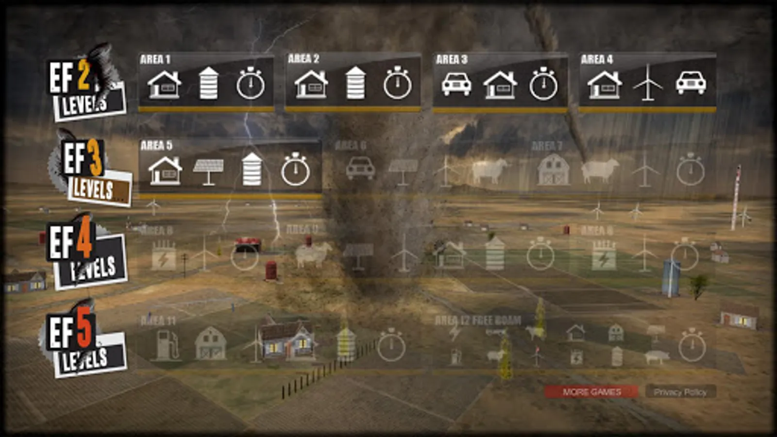 Take full control of this power and destroy as many things as possible, grow from an EF2, EF3, EF4 until you become a gigantic EF5 tornado that eats up buildings, trees, cars, barns and anything else unlucky enough to be in its path!