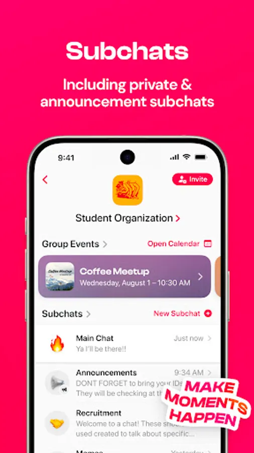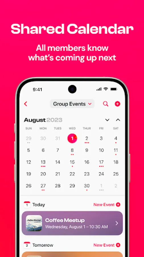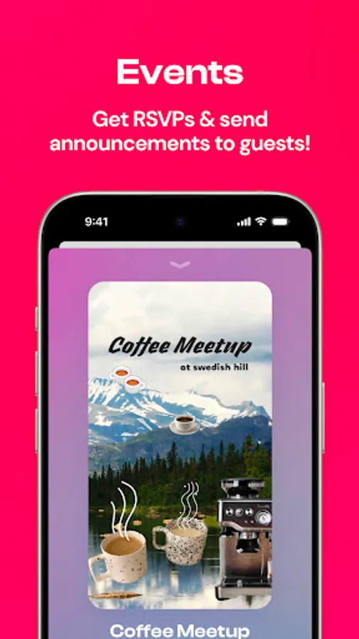 • Events happening in your group stay pinned to the top, right alongside your chats, so nobody misses them.