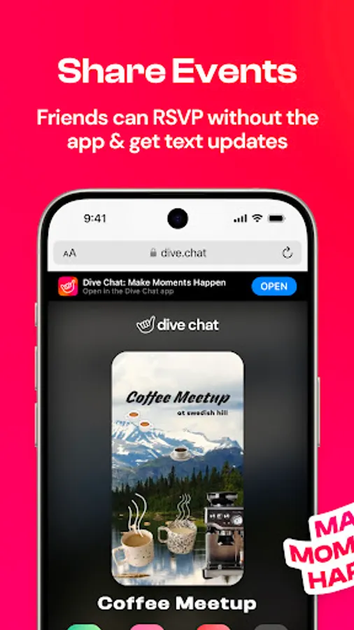 Create Dive Events that you can share with a link so that anyone can see the details and RSVP, even without downloading the app! Better yet, share events in your Dive Groups which are perfect for your friend group, active club, fraternity, sorority, student organization, or anyone you make memories with. MAKE MOMENTS HAPPEN.