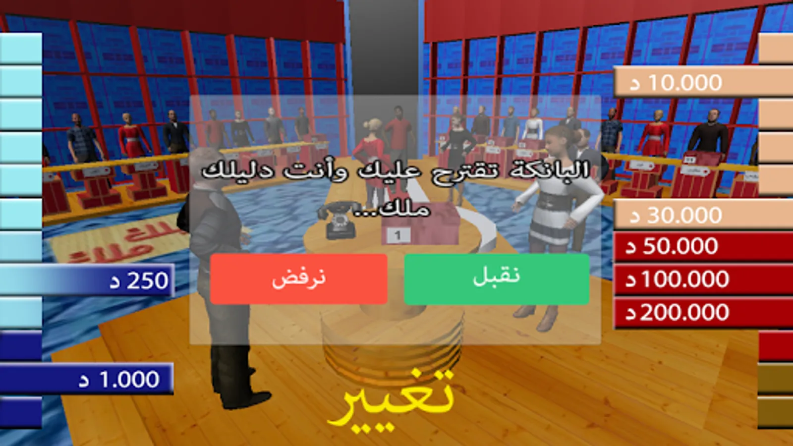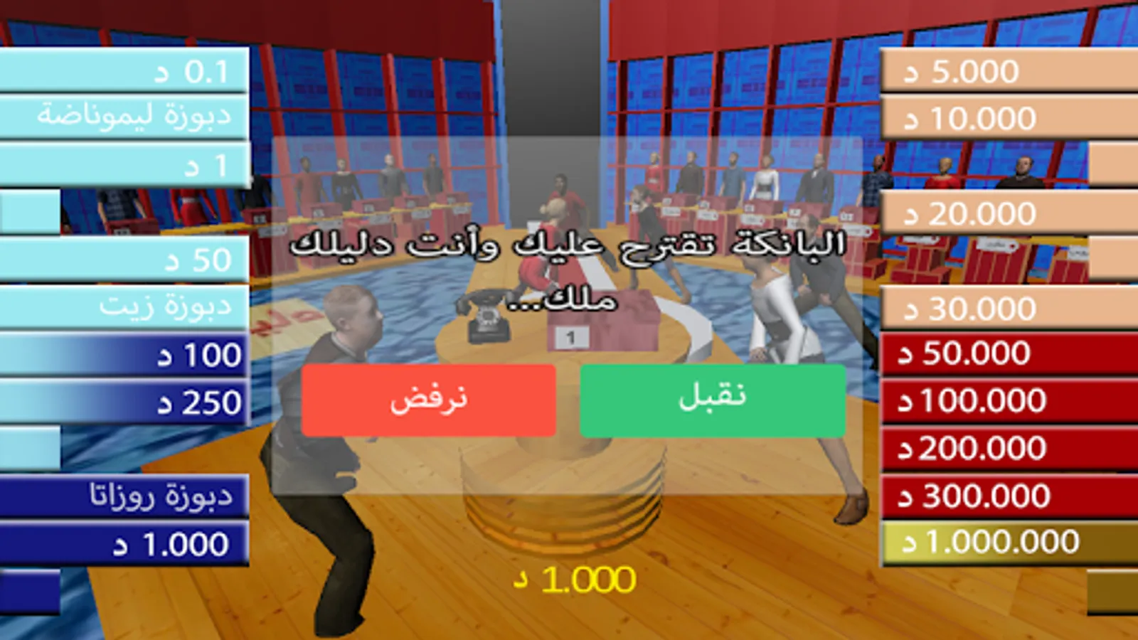 The principle of the game is that the player must eliminate boxes one by one, each time it receives suggestions banker, these suggestions are a sum of money or be an exchange of its box. So every time the player has the choice to accept the offer of the banker or complete the game.
