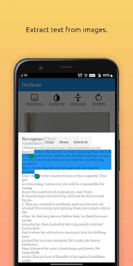 -DocScan has now the capability to extract text from the image, you can do this when you are editing your single image. copy the text in your clipboard and use it whenever you want.
