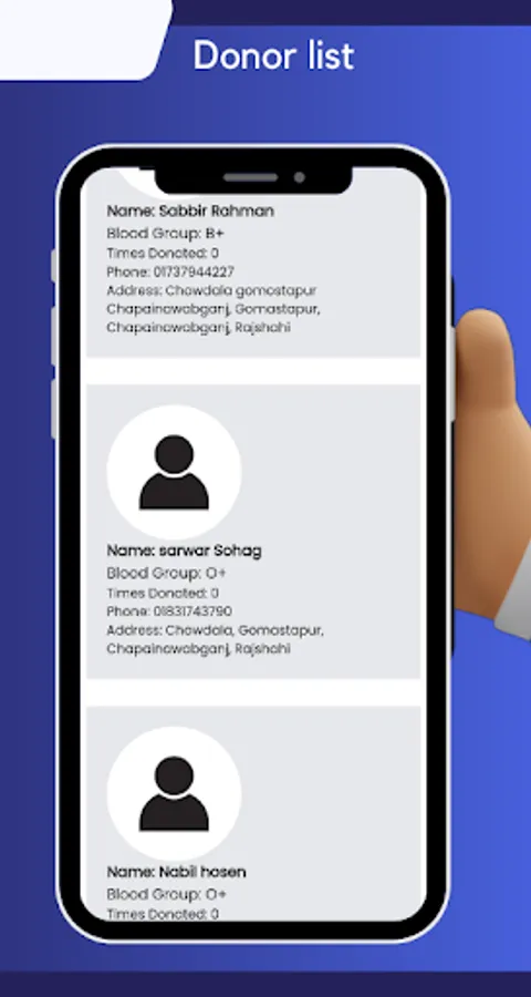 ২। আমাদের অ্যাপ এর মাধ্যমে সহজেই রক্ত পাবেন। এই খানে অনেক ডোনার আছে, যার জন্য