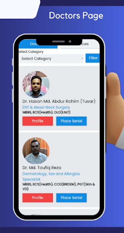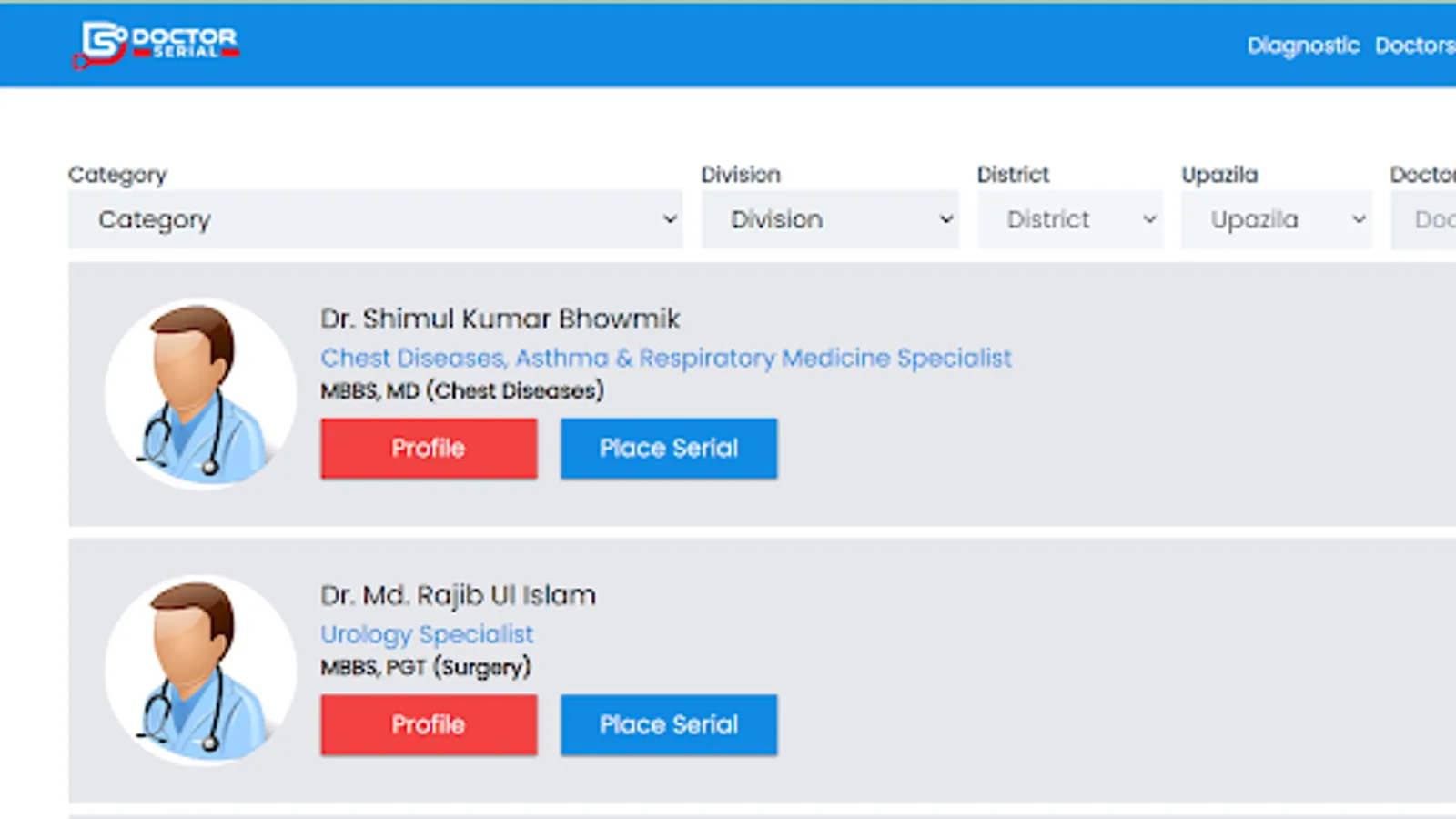 বাংলাদেশে এই প্রথম এক অ্যাপ এ সকল ডাক্তারের সিরিয়াল। সকল ক্লিনিক, ডায়াগনস্টিক সেন্টার এবং বে-সরকারি হাসপাতালের বিশেষজ্ঞ ডাক্তারদের সিরিয়াল পাওয়া যাবে ডাক্তার সিরিয়াল অ্যাপ থেকে ।