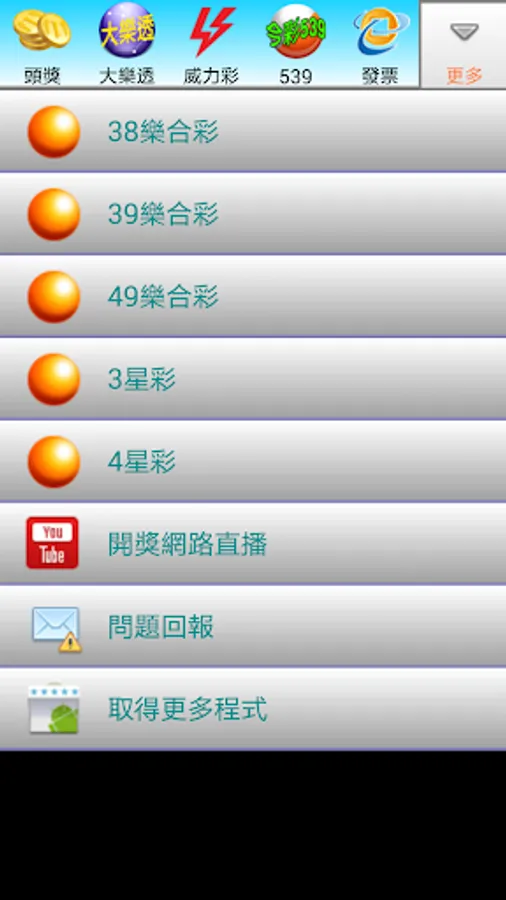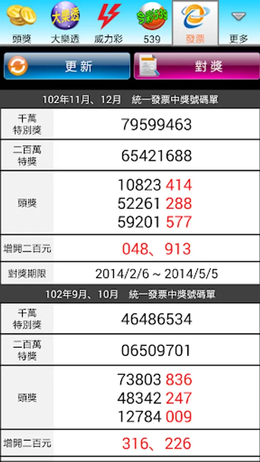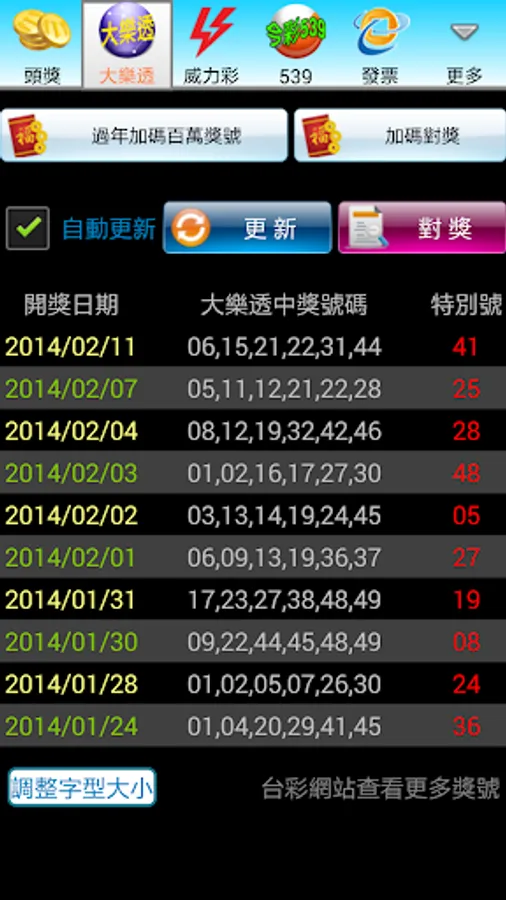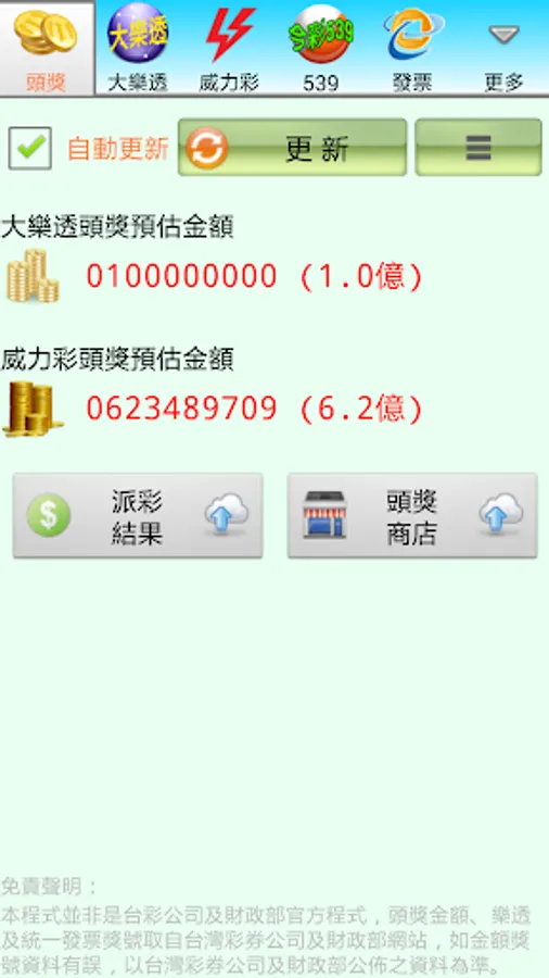 Real-time access to the accumulated jackpots of "Lotto" and "Williams", and also provide big lotto, power, lottery 539, unified invoice, win-win lottery ... six kinds of prize tools, and Samsung lottery, Four-star color, 38, 39, 49 Le Hecai and other prize information.